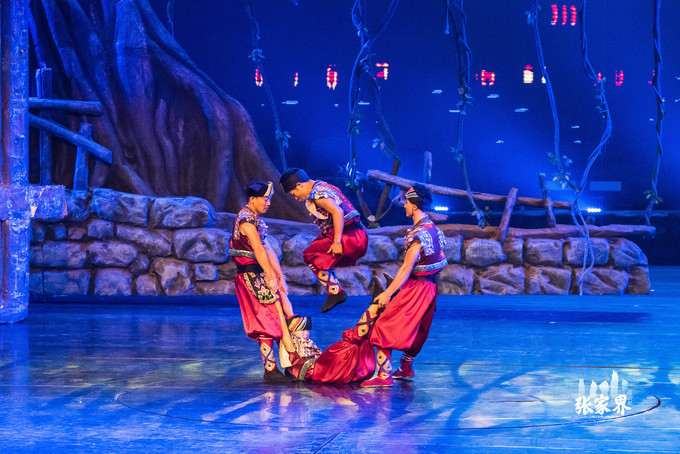 《魅力湘西》四名舞蹈演员大跳“人绳”等令人惊叹的高难度杂技动作,将节目的精彩推向了高潮。