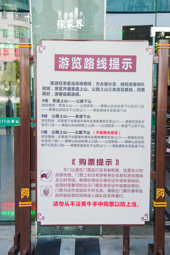张家界天门山景区这里要说明的一下是 天门 山景区总共有三种游玩方式,必须选择其中一种,大部分人一般不是选择A线就是B线,因为 天门 山的99道弯的 盘山 公路和落差有1000米高的索道都是非常有特色的。肯定都是要体验下的,但是听阿钟说,旺季人多的时候,有些游客只能选择C线,因为A线和B线的票都卖完了,所以体验不到世界之最的超高落差索道还是有点遗憾的。