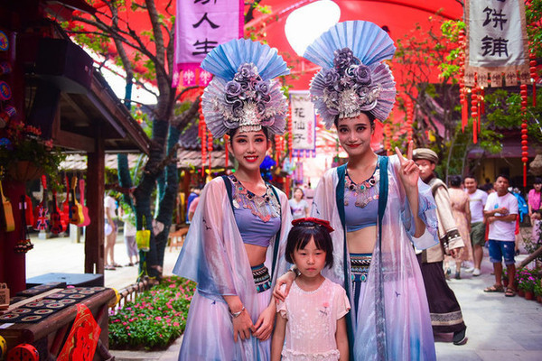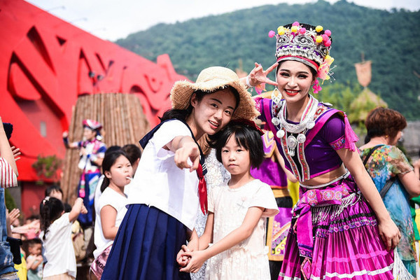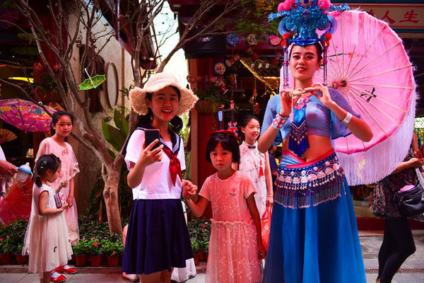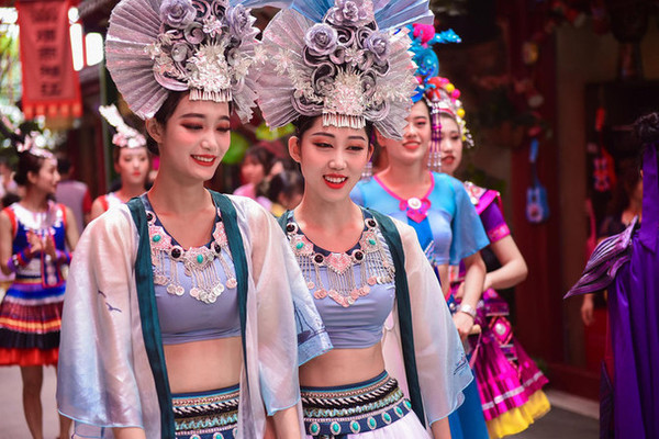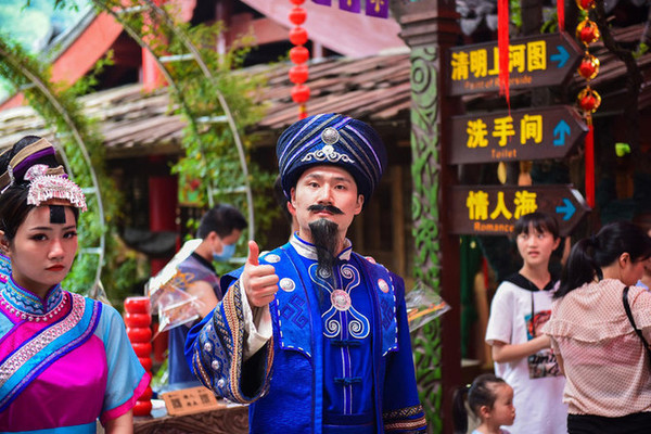 行走在路上随处可见的演职人员都穿着当地有特色的少数民族服饰或表演服装,