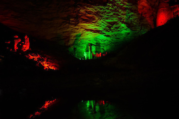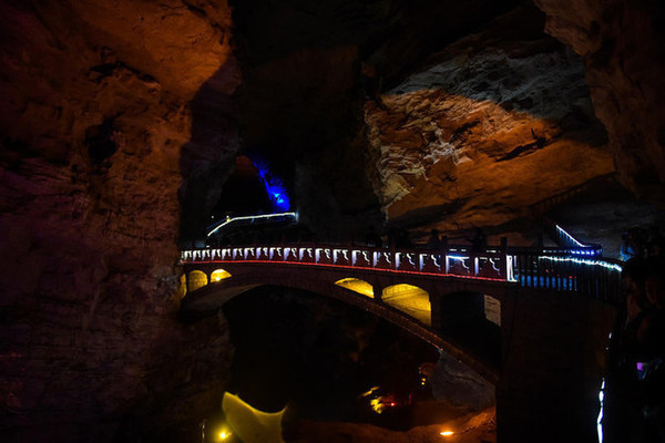 洞内有一个暗河水潭,乘船漂游,抬头可见五颜六色,绚丽多资的钙质沉积物。穹顶石壁滴水沉淀的石乳、 石柱 、石笋、石幔、石琴、石花,如水晶玉石,琳琅满目,异彩纷呈,美不胜收。