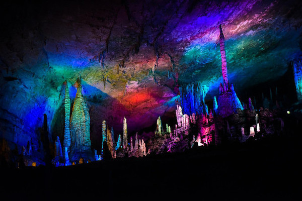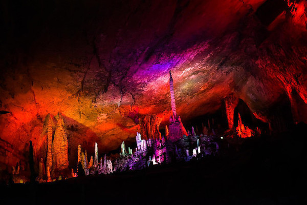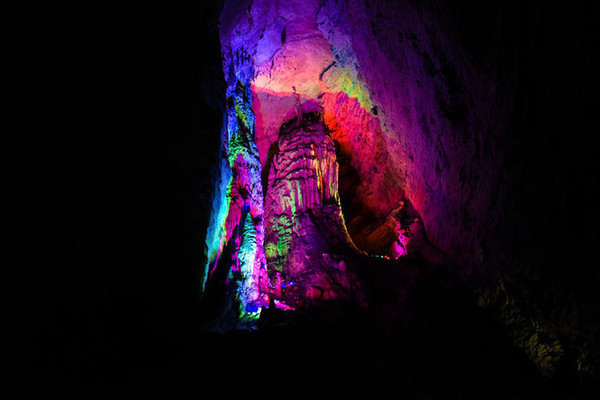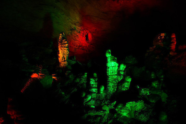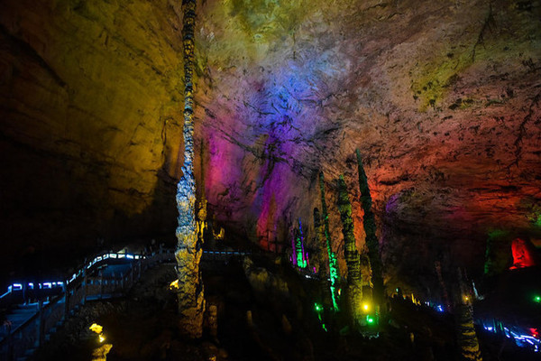 洞中众多的石乳、 石柱 等各种钟乳石,在灯光的照耀下,多姿多彩。