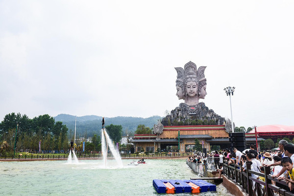 湖中央正表演水上飞人,几个人踩着立式的水上摩托在灵活的做着旋转、空翻和高低错落飞上飞下的表演,围栏边站满了观看表演的人,有不少儿童看的呆住,我家孩子也是目不转睛,直到看完表演才离开。