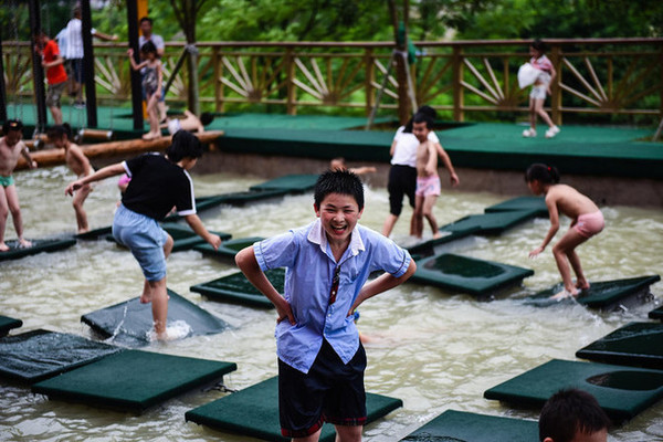 排列的绿色浮台上都是孩子们的身影和欢声笑语。