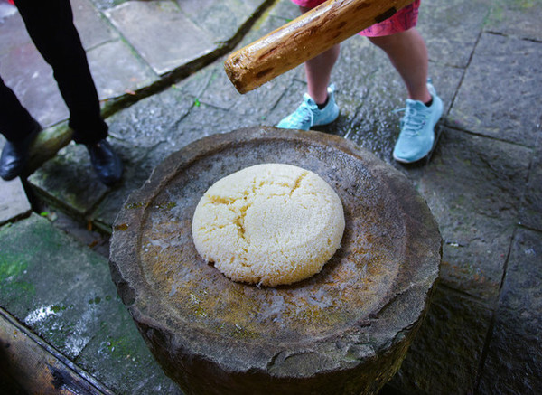 看着白白的大米被一下一下锤砸变得软软糯糯,细腻光滑;