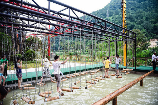 爬麻绳结成的网洞、过晃动的水上木桩、还有最吸引孩子注意力的“水上漂”项目。
