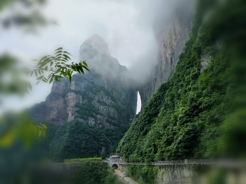 天门洞是世界海拔最高的天然穿山溶洞,三国吴永安六年(公元263年),嵩梁山峭壁轰然洞开,玄朗如门,吴王视为吉祥,亦由此改称天门山,下置天门郡。天门洞南北对穿,门高131.5米,宽57米,深60米,拔地依天,宛若一道通天的门户。这一胜景,吸引着历代帝王官臣、隐贤逸士、高僧老道、文人墨客前来探访游赏,历经世代累积,形成了天门山独特厚重的“天文化”。天门山是张家界最高海拔的山峰,“天门吐雾”、“天门霞光”被人誉为举世罕见的景象奇观。