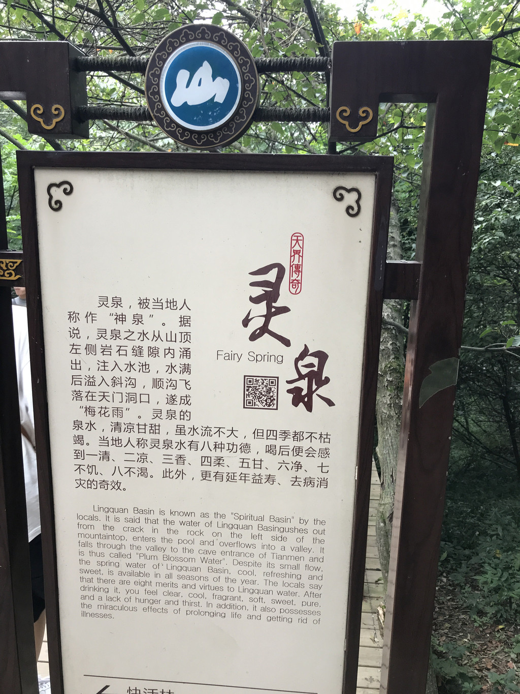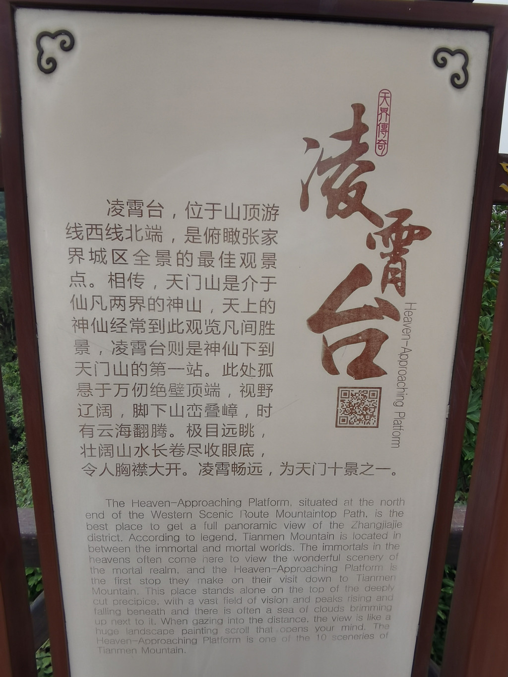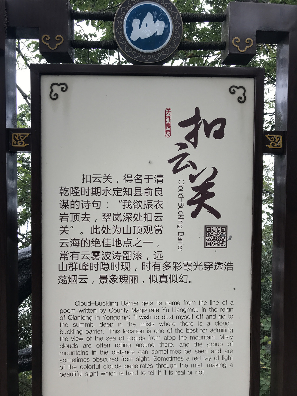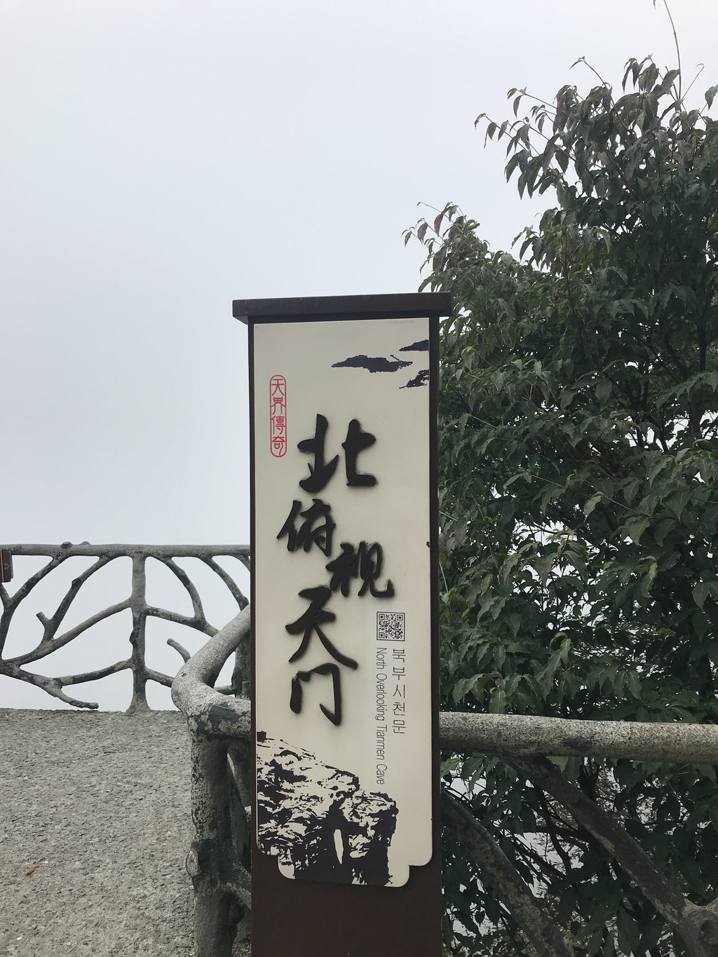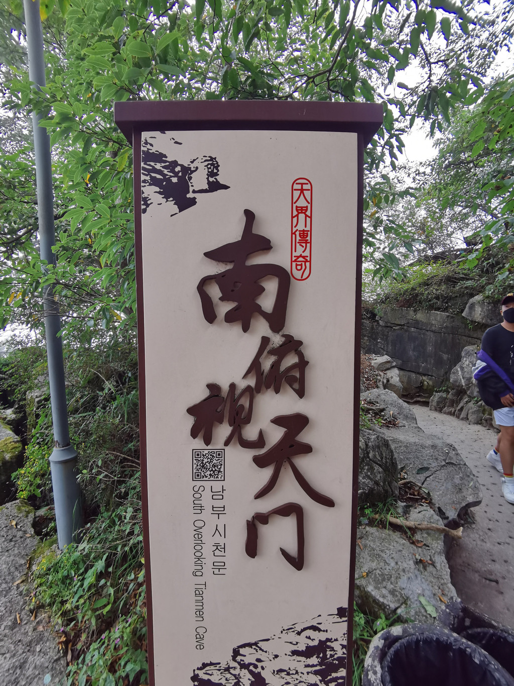 第三天(9月9日)早上7:15游客中心购票,我们买的天门山A线票278元。7:50天门山索道站(下站)出发,大约运行25-30分钟到达山顶索道站(上站)。出索道站(上站)后顺行来到一个小平台,直接看到(正前方)的是东线标志牌。西线标志牌在左手边,因树木遮挡不易发现。