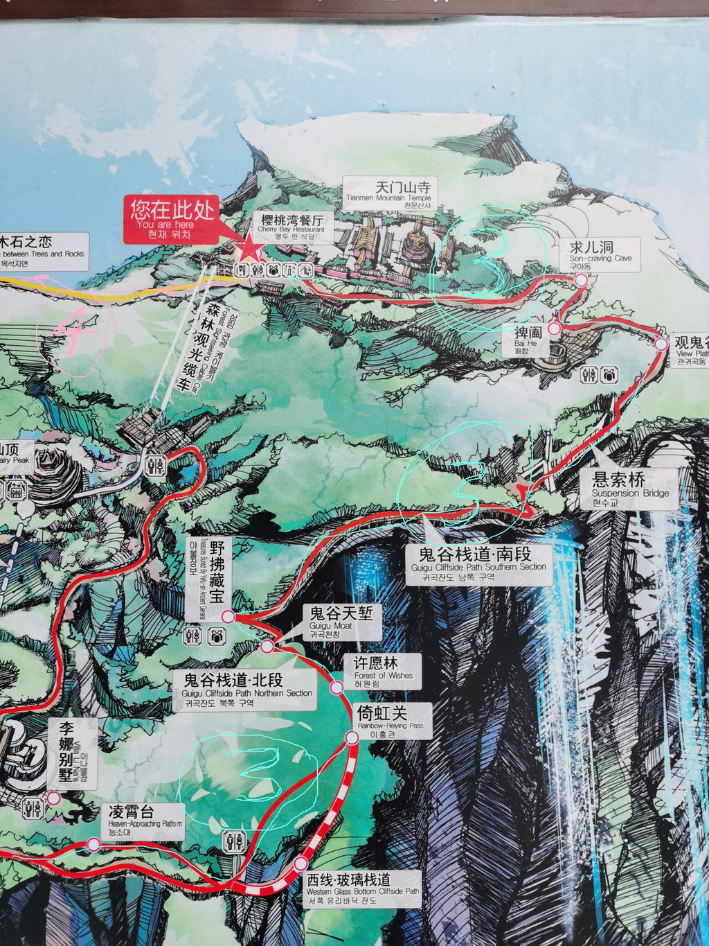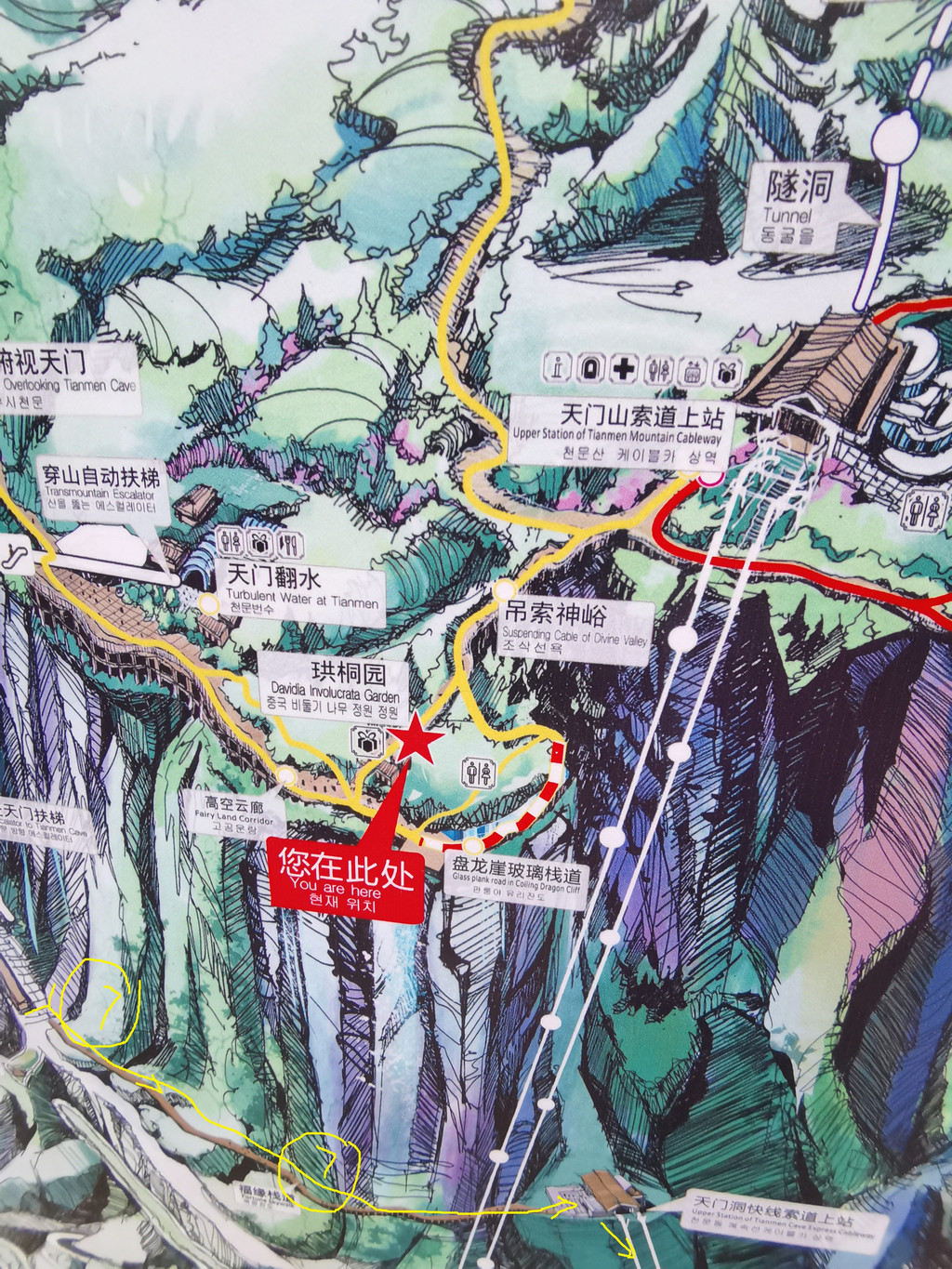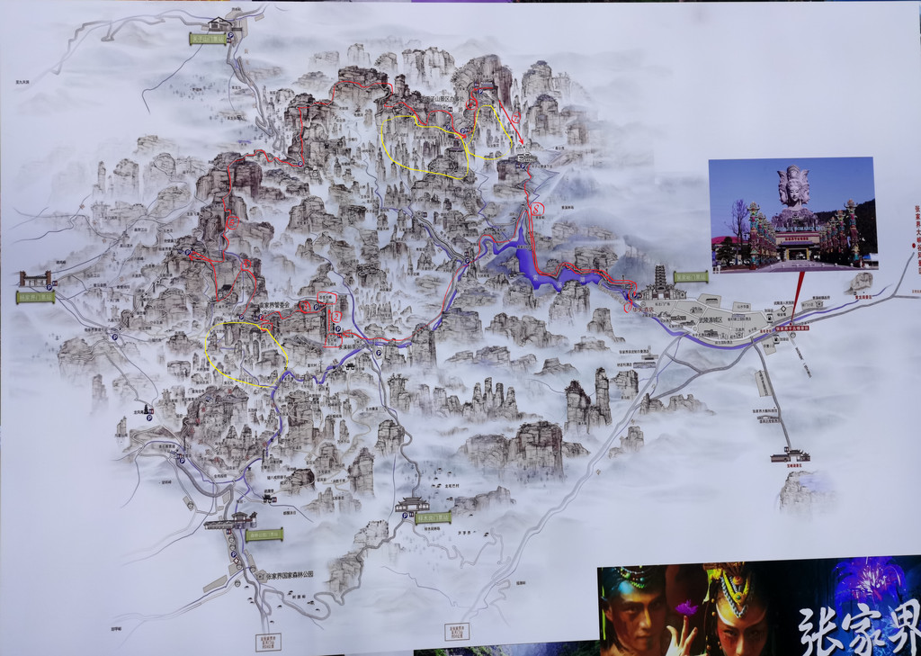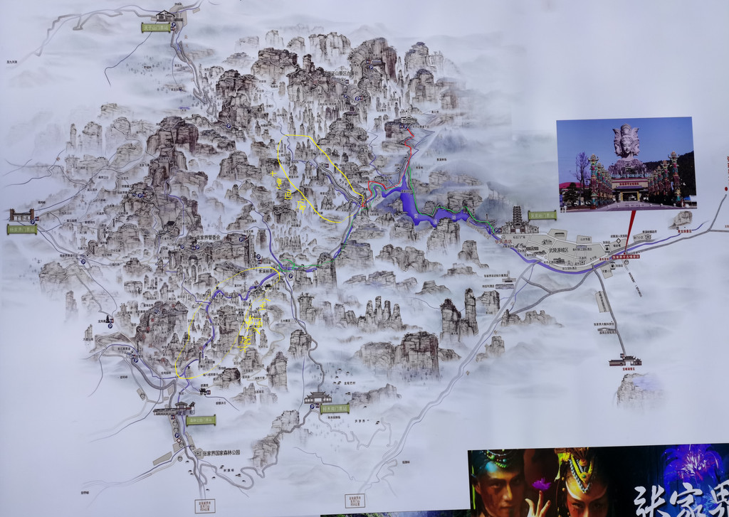 图中红线代表乘车、天梯和索道的部分,黄色区域为步行所欣赏的景点区域。上部为天子山景区,下部为袁家界景区。杨家界部分我们只看了天然长城一处景点(图上居然没找到)。因为正处于国庆前的景区维修时段,很多景点未开放,此次正赶上杨家界和黄石寨90%在维修,基本没开放。