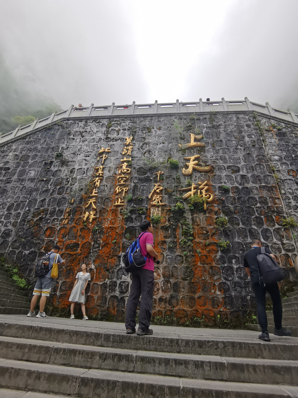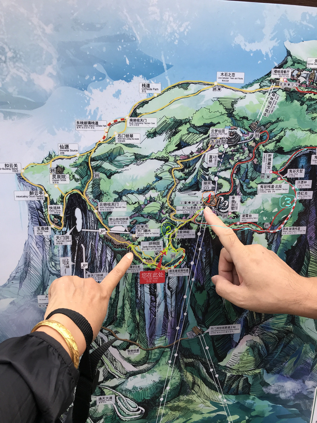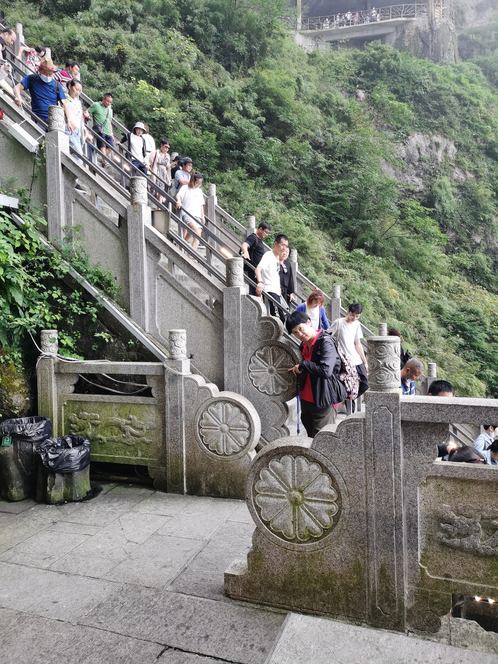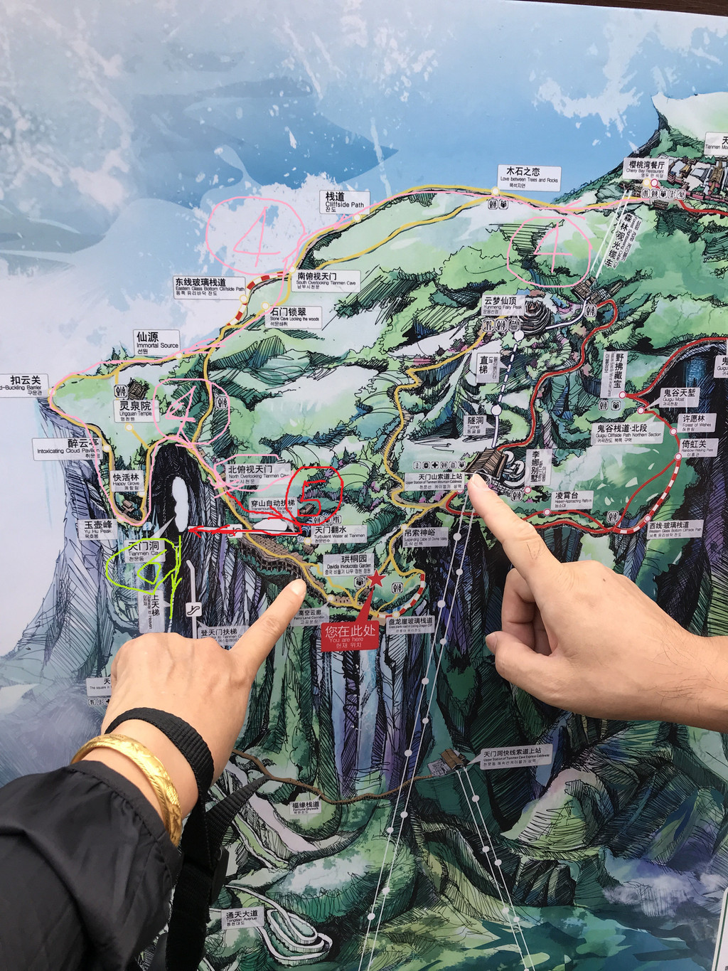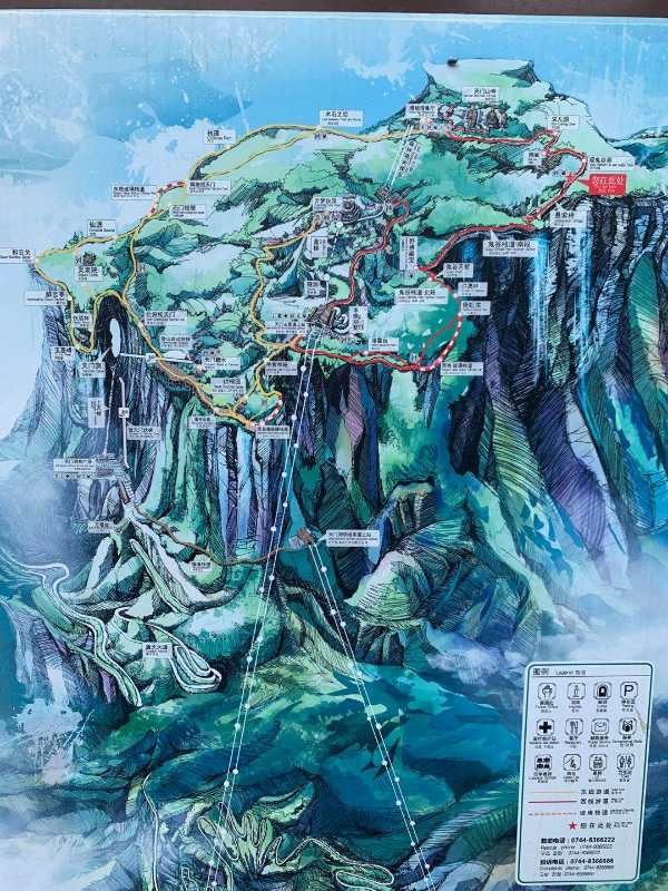 到这里该轮到关键问题:为了不爬或少爬山、究竟怎么走最好?出发前看了很多游记、攻略类资料,决定按照资料上说的中线上、西线下、横穿至东线天门洞再下山的计划。结果到这里一问,只有“东线“和“西线“。最后在山上工作人员指点下,选择了最终的线路(只舍弃了一个景点:云梦限顶)。