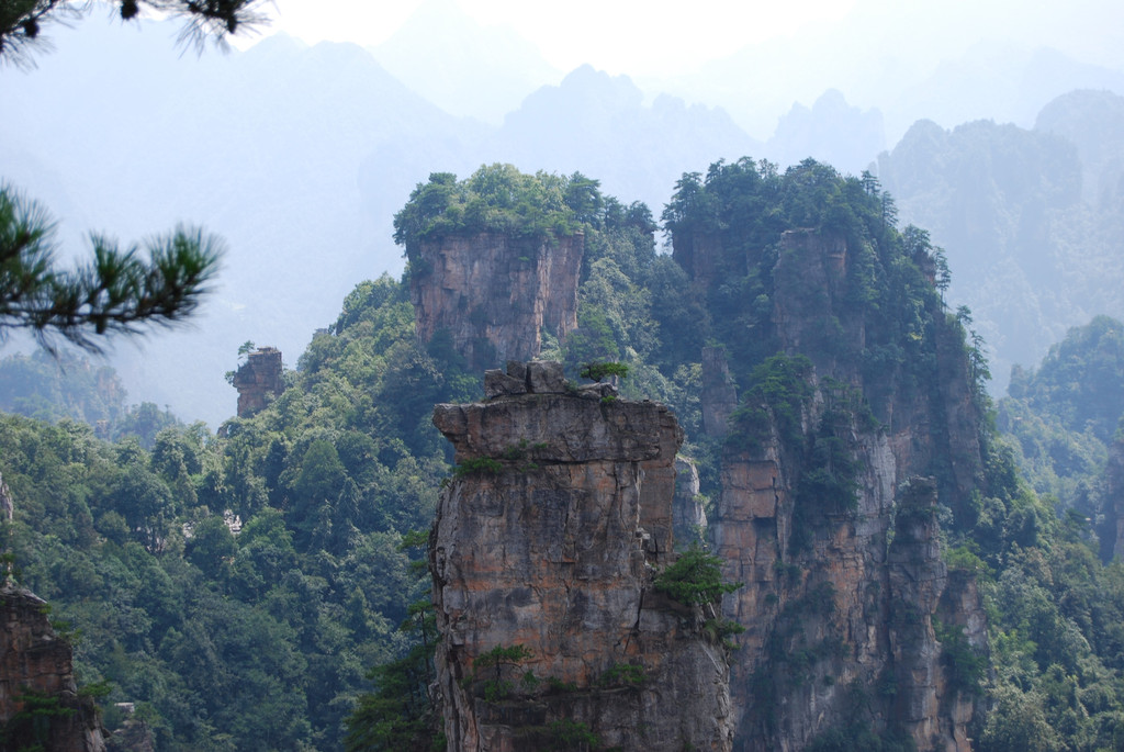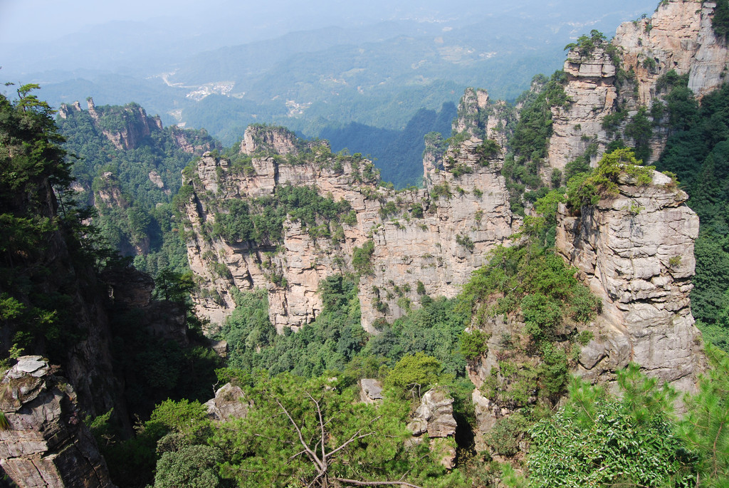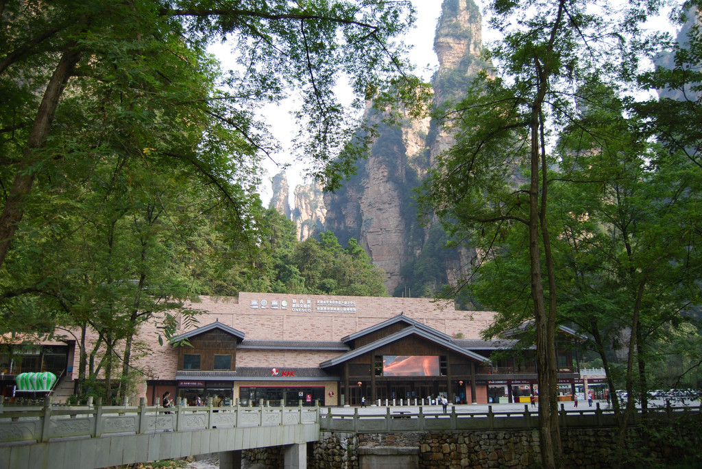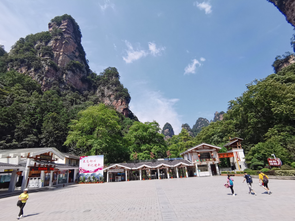普通游客走得最多的就是袁家界入口。下面这张照片是从我们住的酒店往景区入口走,从入口处的广场上看景区大门(塔的右边是景区入口,左边是出口)。