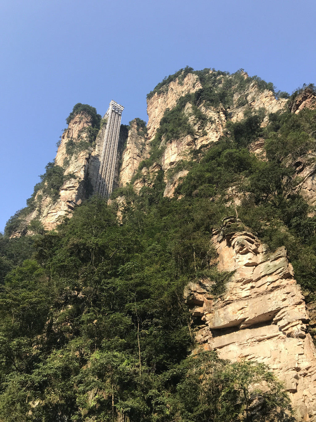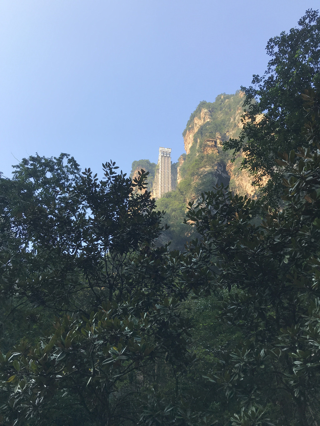 电梯上行只需大约1分半钟,再乘坐摆渡车到袁家界景区的迷魂台下车,