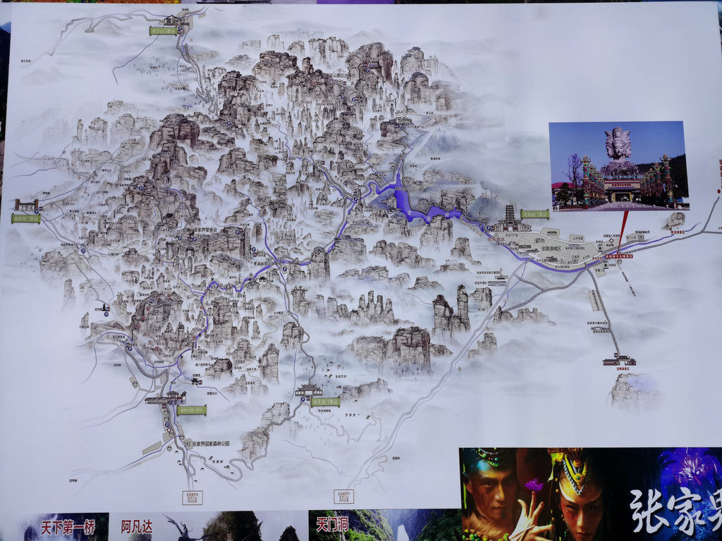 景区有两个出入口,一个是水绕四门这里的出入口,还有一个就是张家界森林公园出入口。有名子的景点多数靠近森林公园大门的那一半。