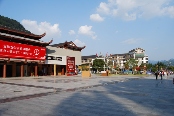 这张照片是站在景区门口广场上,面向武陵新天地华天精选酒店(照片中高处有几个红字的地方)方向拍的。