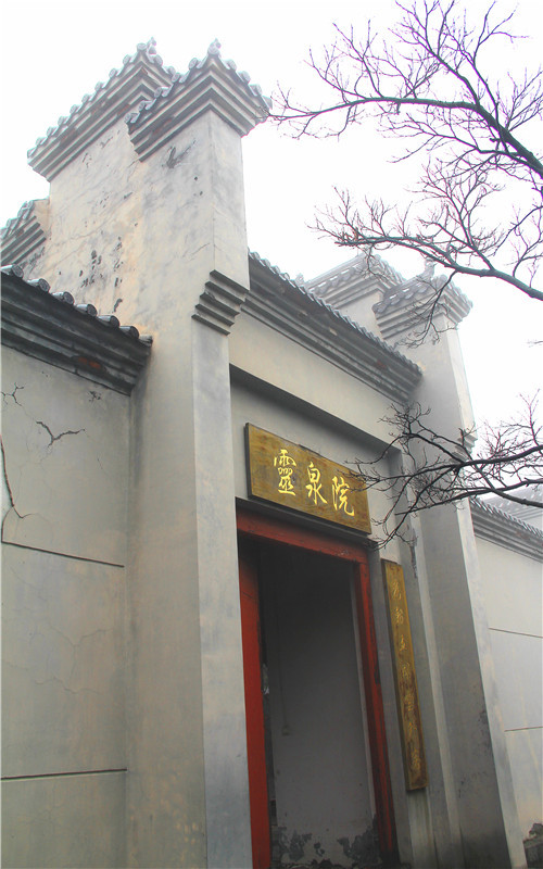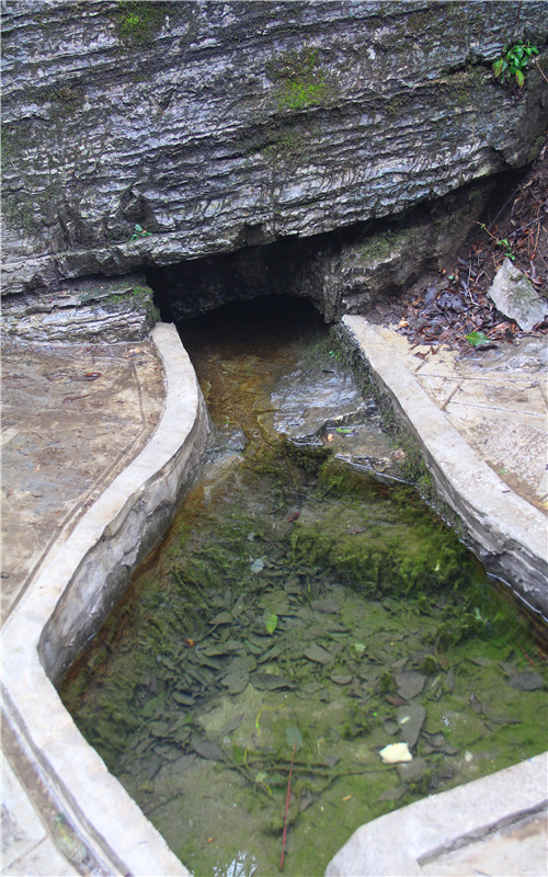 灵泉的水是从左侧的岩石缝隙内涌出的,注入水池,水满后溢入斜沟,顺沟飞落在天门洞口,就是梅花雨了。