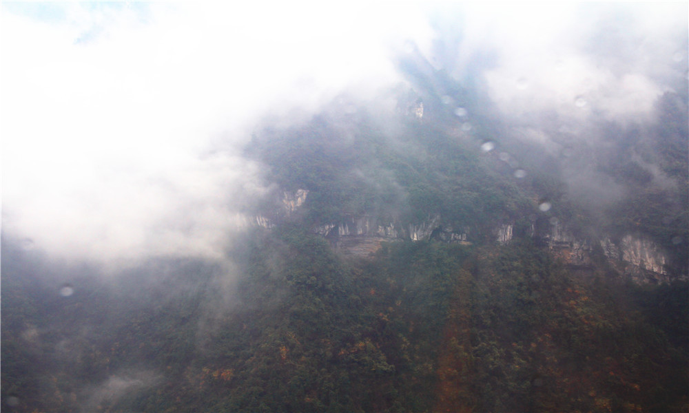乘坐索道下山,雾好像小了,远处的山峦美景能看清了。