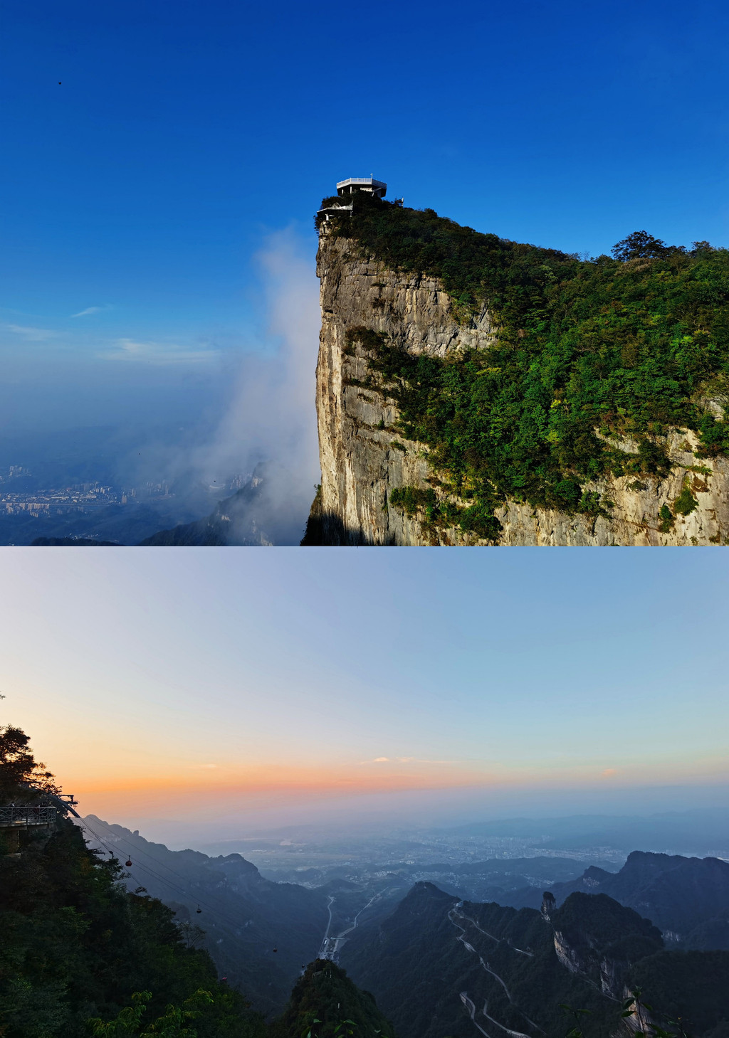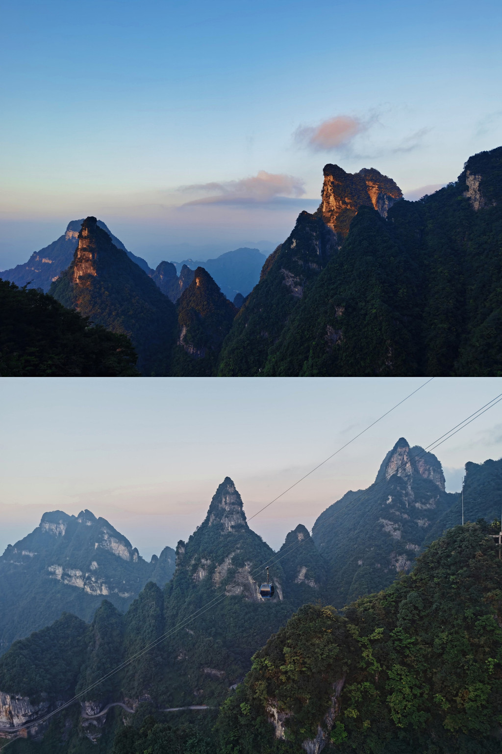 这图是不同时间的对比,下面索道是下午1~2点;上面的山峰是傍晚十分,有晚霞拂过