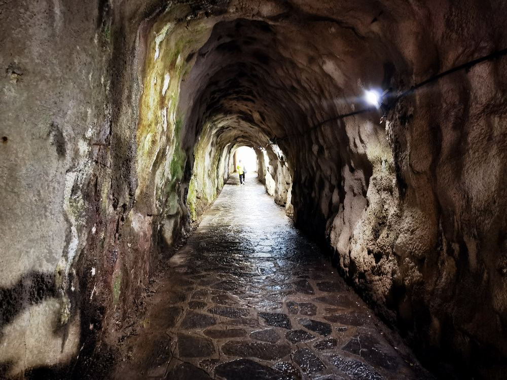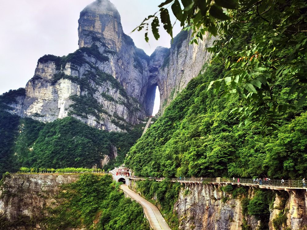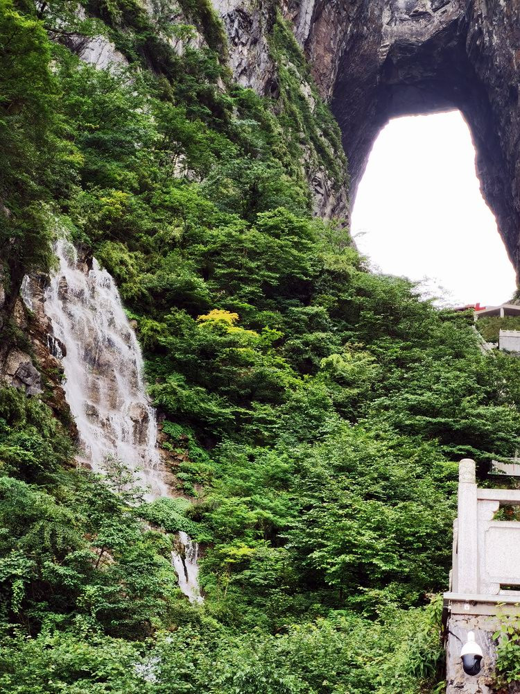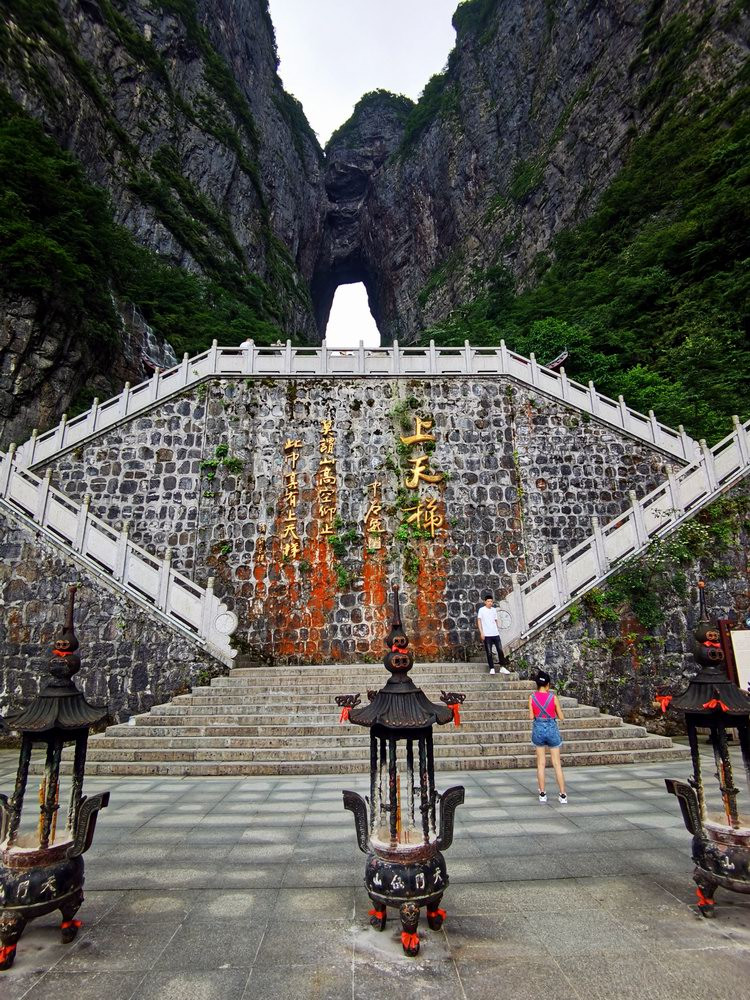 天门洞,位于天门山山体中部,是台地边缘的一个地下溶洞,因向斜构造之力挤压、坍塌、溶蚀,南北两端岩层崩落,裸露天门。这是下999级石阶途中拍的天门洞。