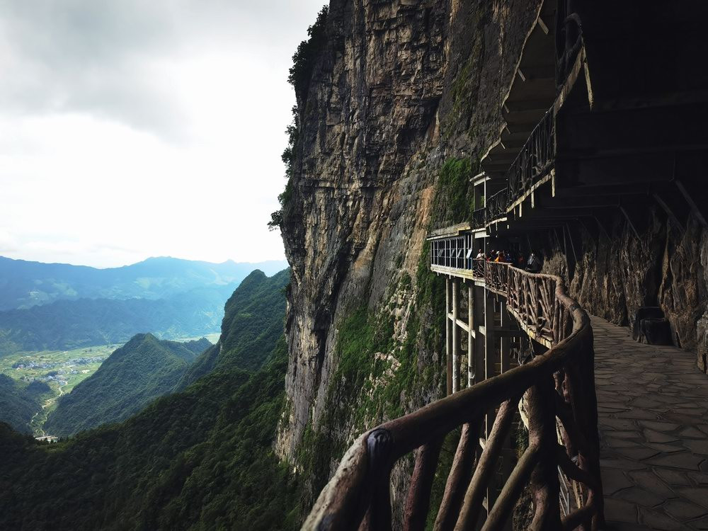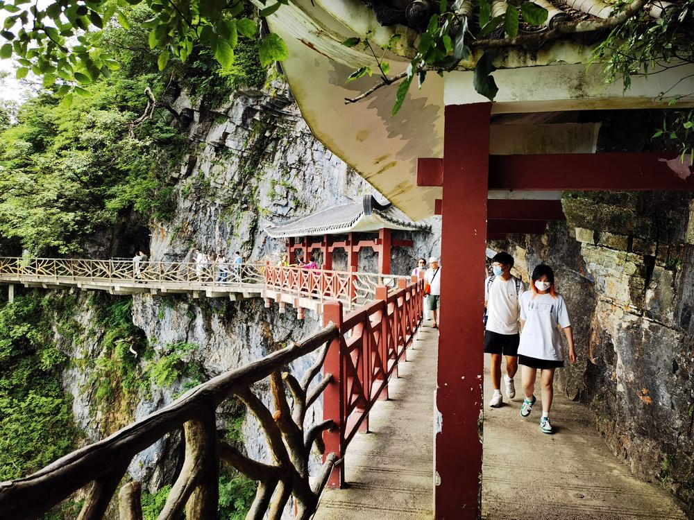 鬼谷栈道,因悬于鬼谷洞上侧的峭壁沿线而得名。栈道全长1600米,平均海拔为1400米,全线立于万丈悬崖间,举目远眺,峰峦险峻,以“惊、悚、险”著称于世。栈道悬于峭壁之中,雨后天晴的好开气,栈道沿线常出现云海、云瀑等奇观,云蒸霞蔚,恍若人间仙境。