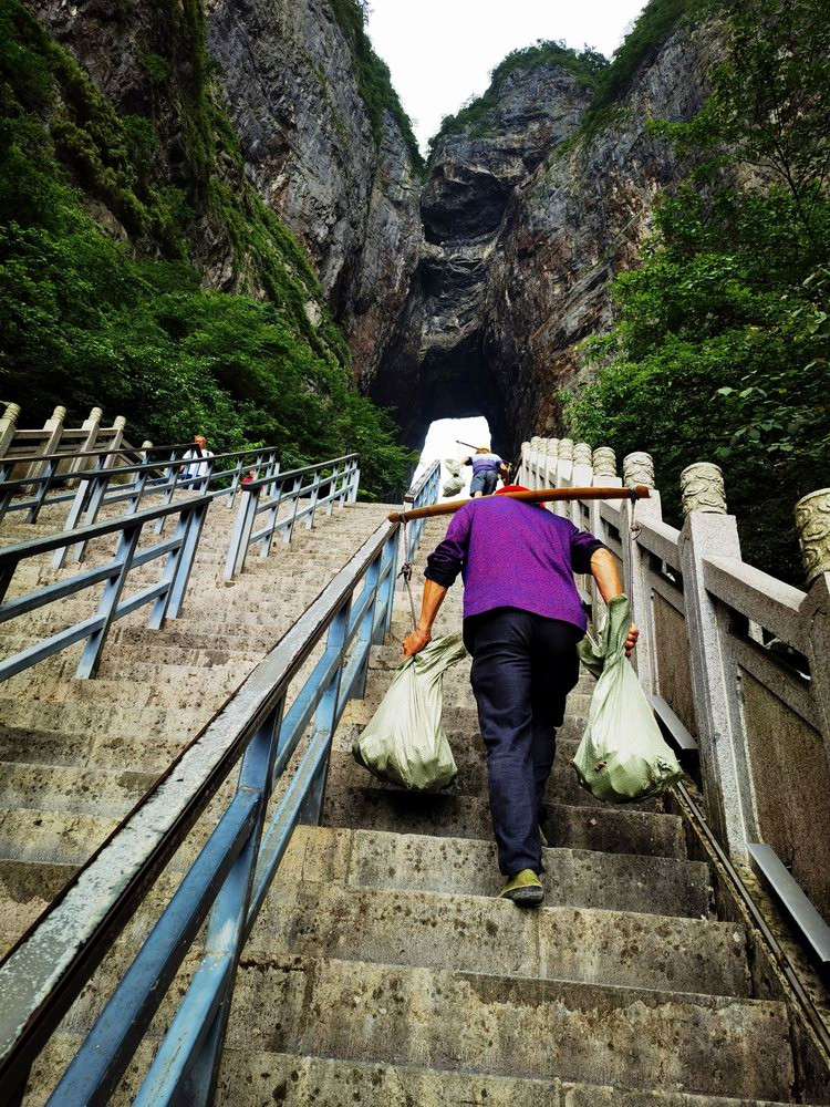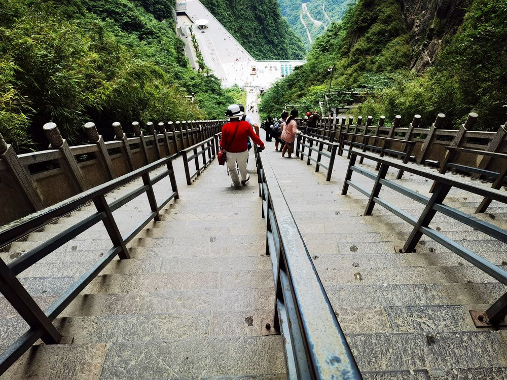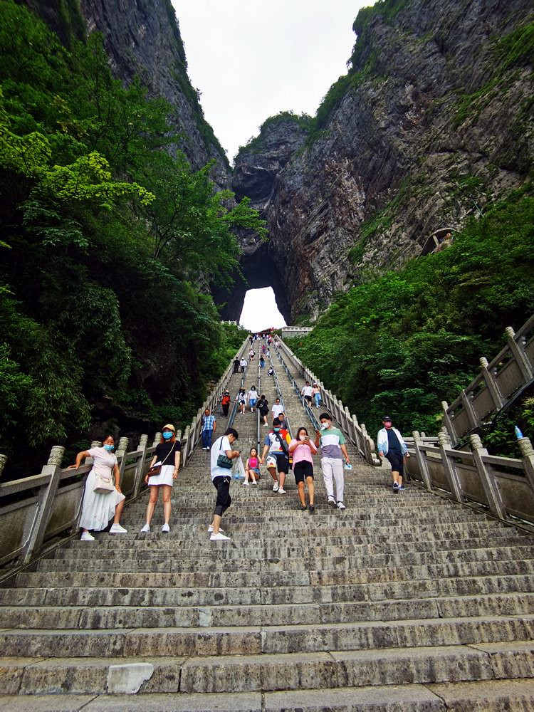 天门洞是张家界天门山的标志和第一亮点,曾经的飞机穿越天门洞表演使它闻名于天下。这个洞不是人工开凿的,而是一个纯天然的穿山溶洞,因此绝对是奇观。要上到洞内,必须经过999级石阶的“上天梯”。我们是反其道而行之,下999级石阶。
