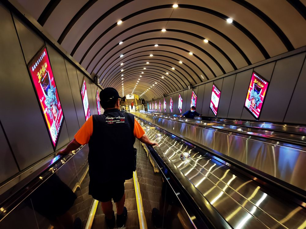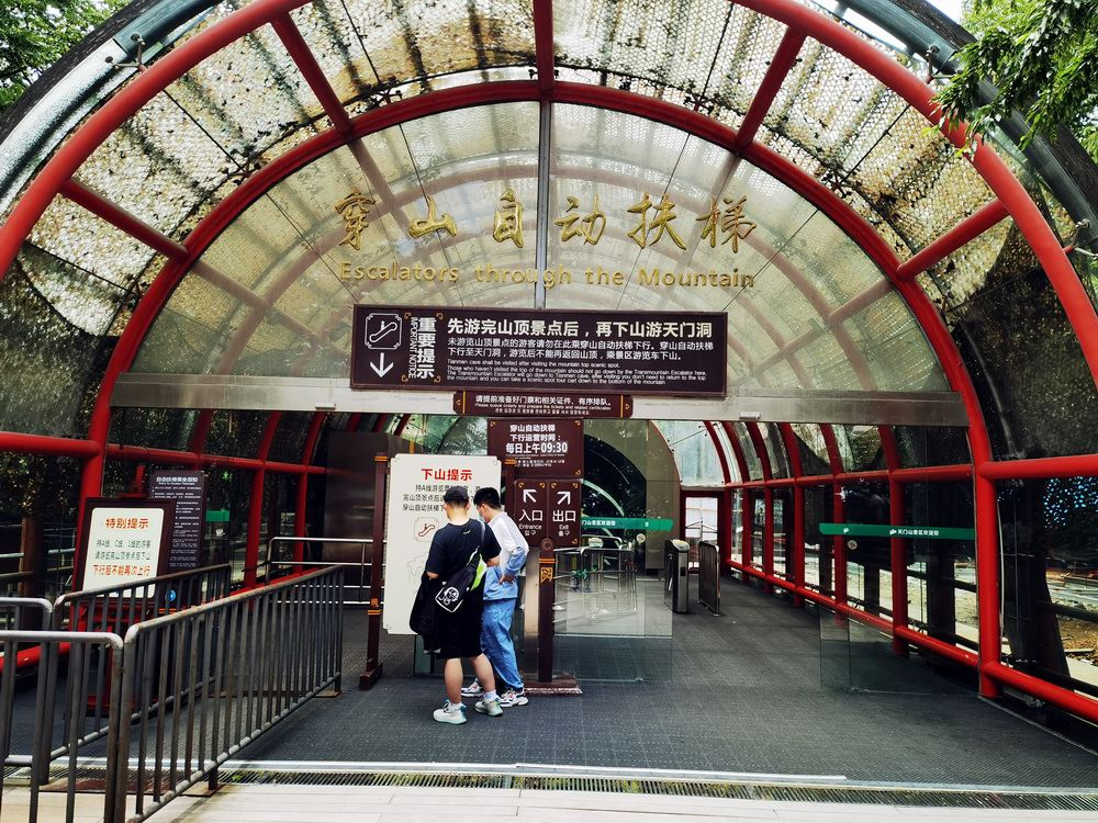 全球首条在山体隧道内安装的电梯——天门山穿山电梯已正式开通运行。穿山电梯全程在山体隧道中运行,从天门洞底直达山顶,共12段,扶梯梯级运行总长度为897米,提升高度340米,总跨度为692米,有16台30米超大高度重载公交型自动扶梯、3台20米大高度重载公交型自动扶梯,拥有单向3600人/小时的输送能力。图为天门山穿山电梯的入口。