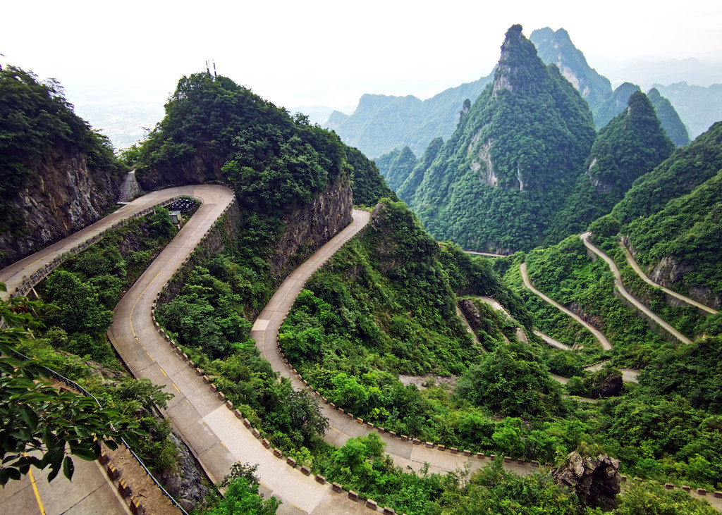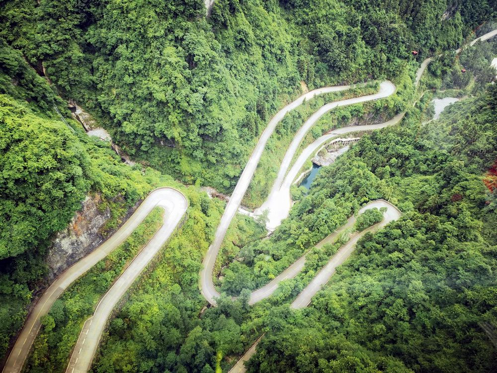 缆车下方还能看到鼎鼎大名的天下第一公路奇观——天门山盘山公路。盘山公路全长约11公里,海拔从200米急剧提升到1300米,大道两侧绝壁千仞,空谷幽深,共计99个弯,180度急弯此消彼长,似玉带环绕,弯弯紧连,层层迭起,有通天大道之称。
