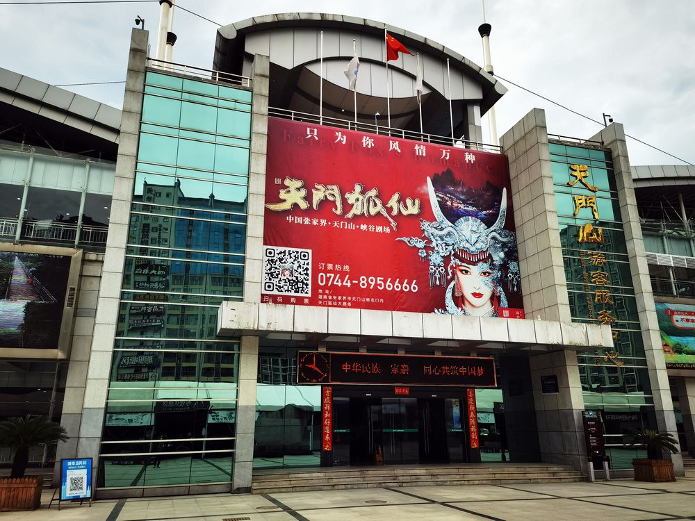 天门山索道是耗资2.6亿打造的亚洲最长的高山客运索道,全长7455米。整条索道以张家界市中心的城市花园为起点,直达天门山顶的原始空中花园,犹如一道彩虹飞渡人间天上,又似一条巨龙腾翔素云苍穹,依山籍壁,恢宏壮观。图为张家界市中心城市花园起点的天门山游客服务中心。
