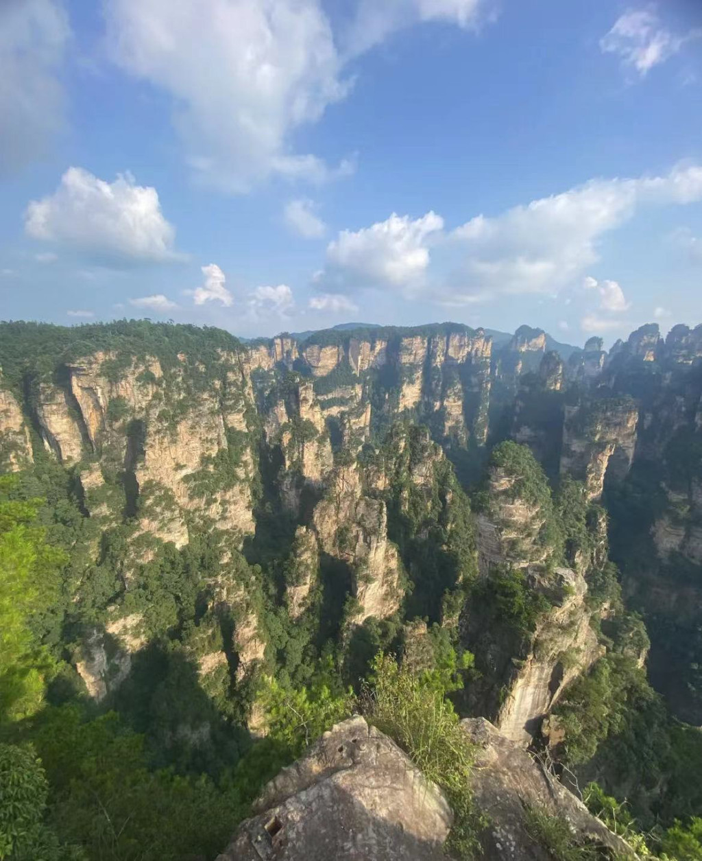张家界 国家森林公园:我们从南门进出,因为住 武陵源 市区,这个门方便,园区有好多个门,相隔很远,由免费环保车连接。上行坐天子山索道,下行坐百龙天梯。中间都是环保车。没有怎么排队,就逛完了。照片里的景点都在车站步行几分钟的地方。老人小孩都可以到达。