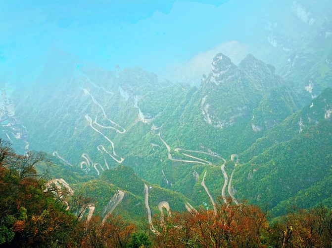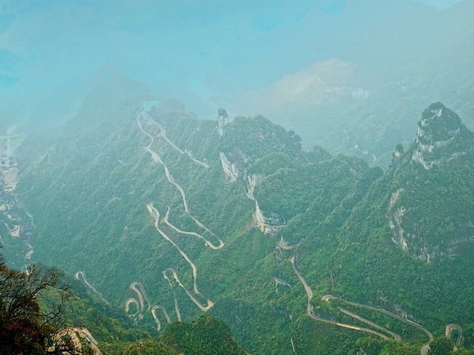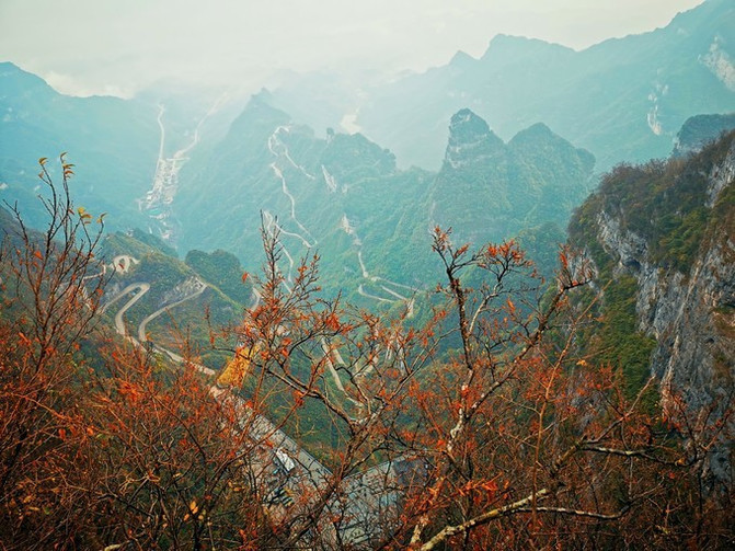 分享一些我很喜欢的图片,这里就是天门山的九曲十八弯了。看看这里的山路,在山间各种纵横交错。我们没有选择坐观光车,主要是,安全不敢这么玩啊。