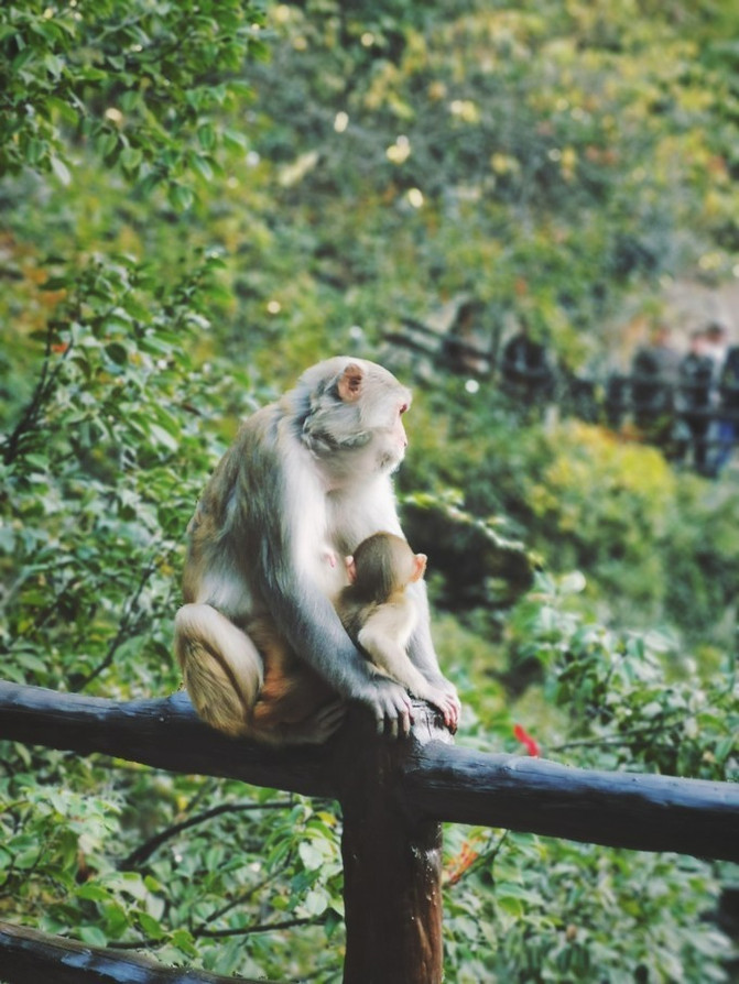 但是,当你往远处看的时候,这里的山峰还是绿油油的,漂亮极了。然后,在这里还看到了超级可爱的猴子。天门山和黔灵山一样,猴子都特别多。
