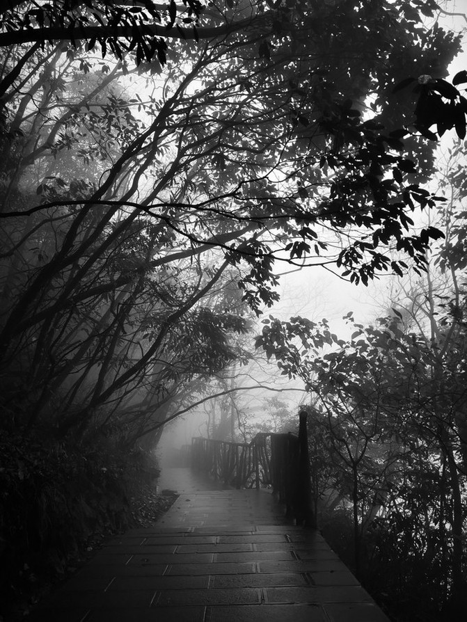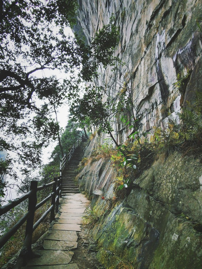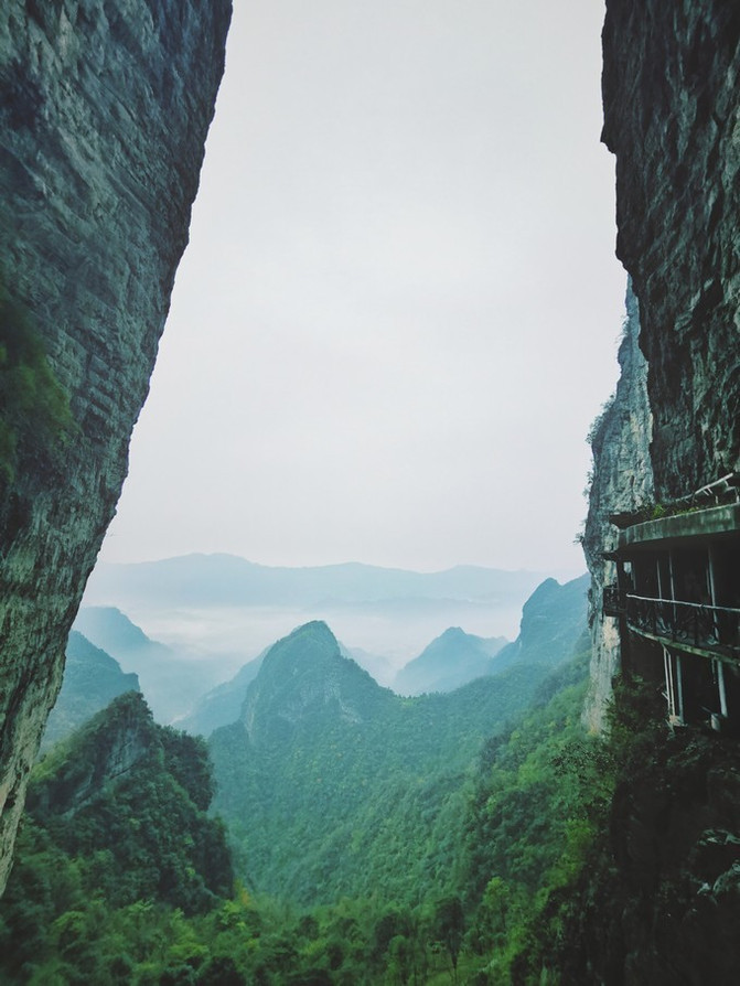 到了国家森林公园。我最喜欢玩的并不是玻璃栈道,而是这种林间小路。鬼谷栈道简直太好看了。和它的名字一样,这里看上去就是很幽森的感觉。这个栈道基本上都是挨着岩石建成的。整个栈道有1.6公里长。走在这里,看着雾气缭绕的景色,似乎随时有一个仙女会过来似的。不过,因为雾气茫茫,我反倒更担心有什么野兽出没而不所知啊。