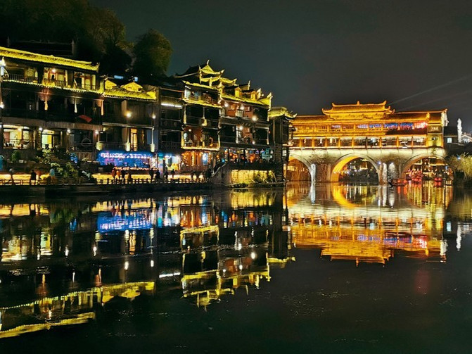看看,这便是晚上的凤凰古镇了。格外美好。远处的房子就好像是皇宫一般。再看看远处的房子,前面就是一个拱形桥,看上去就好像是建造在拱形桥上面的房子似的。