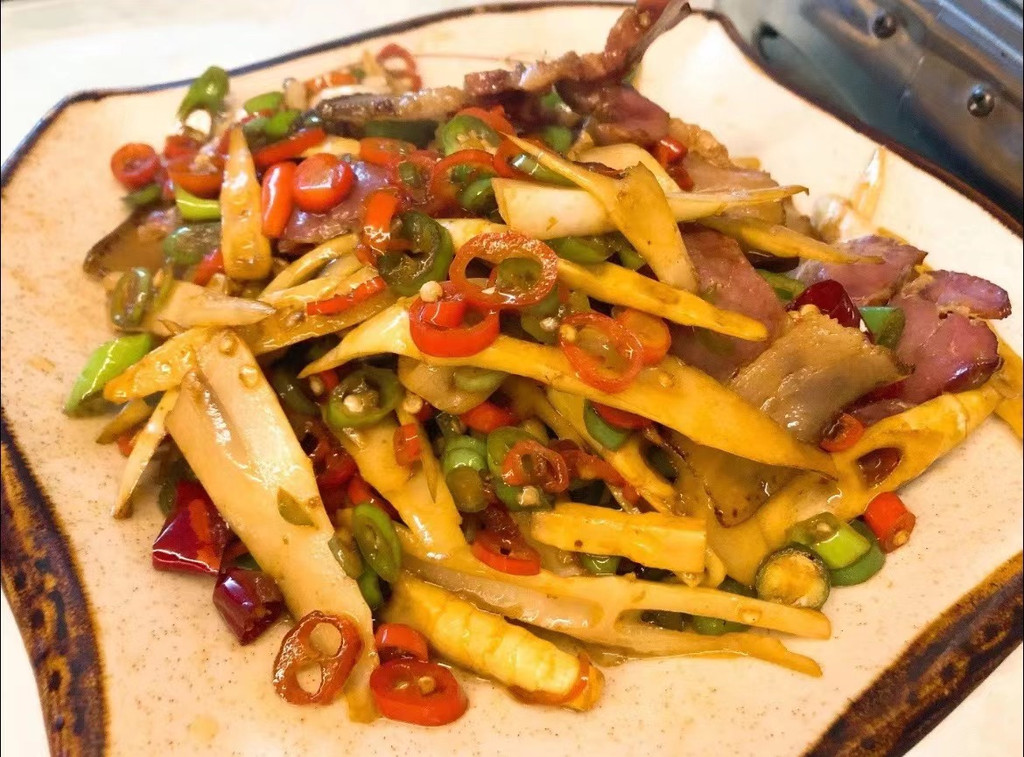 农家小炒肉:柴火的香气加上特有的山野辣椒让此菜味道更为独特,吃起来特别爽口。