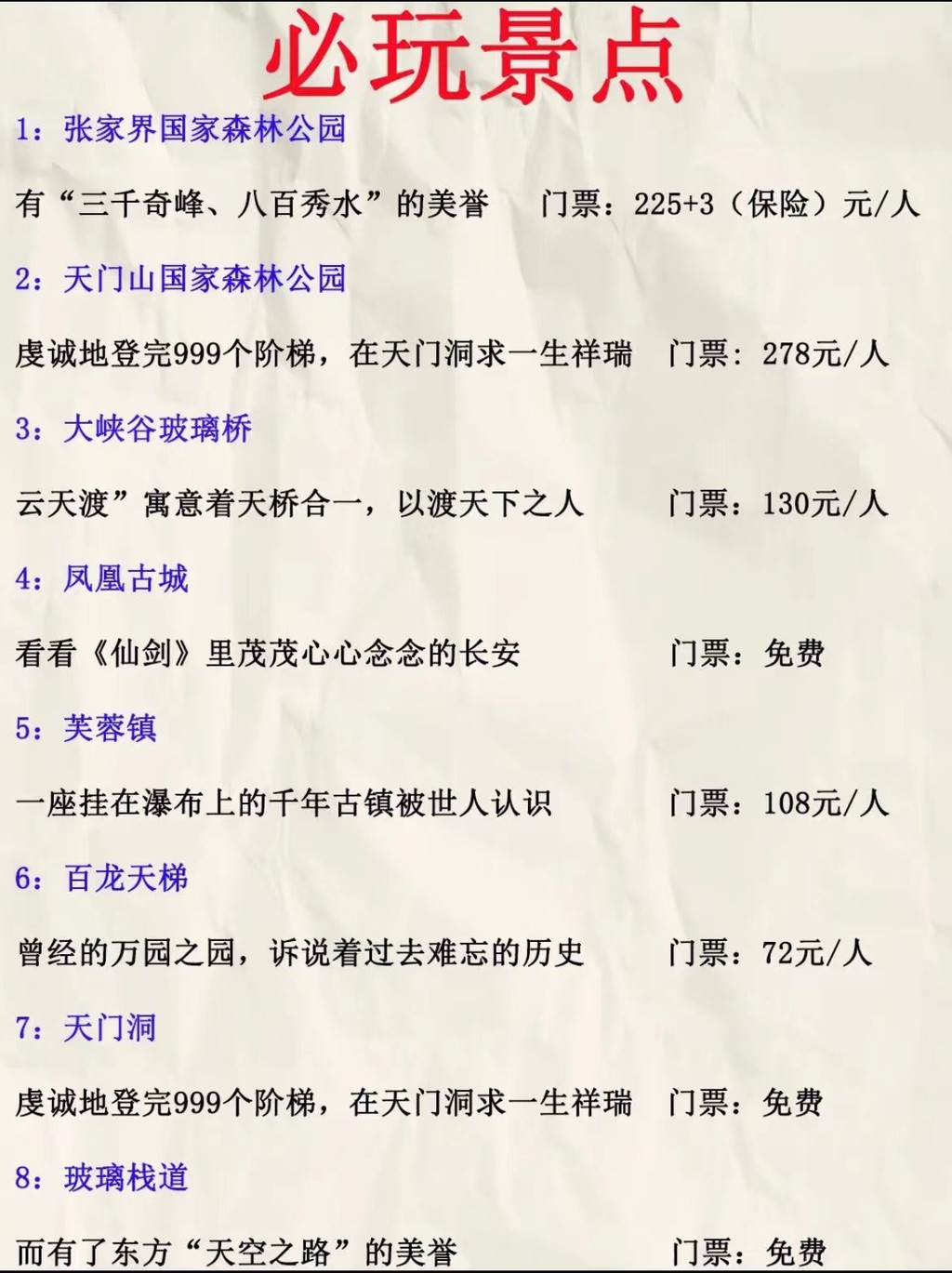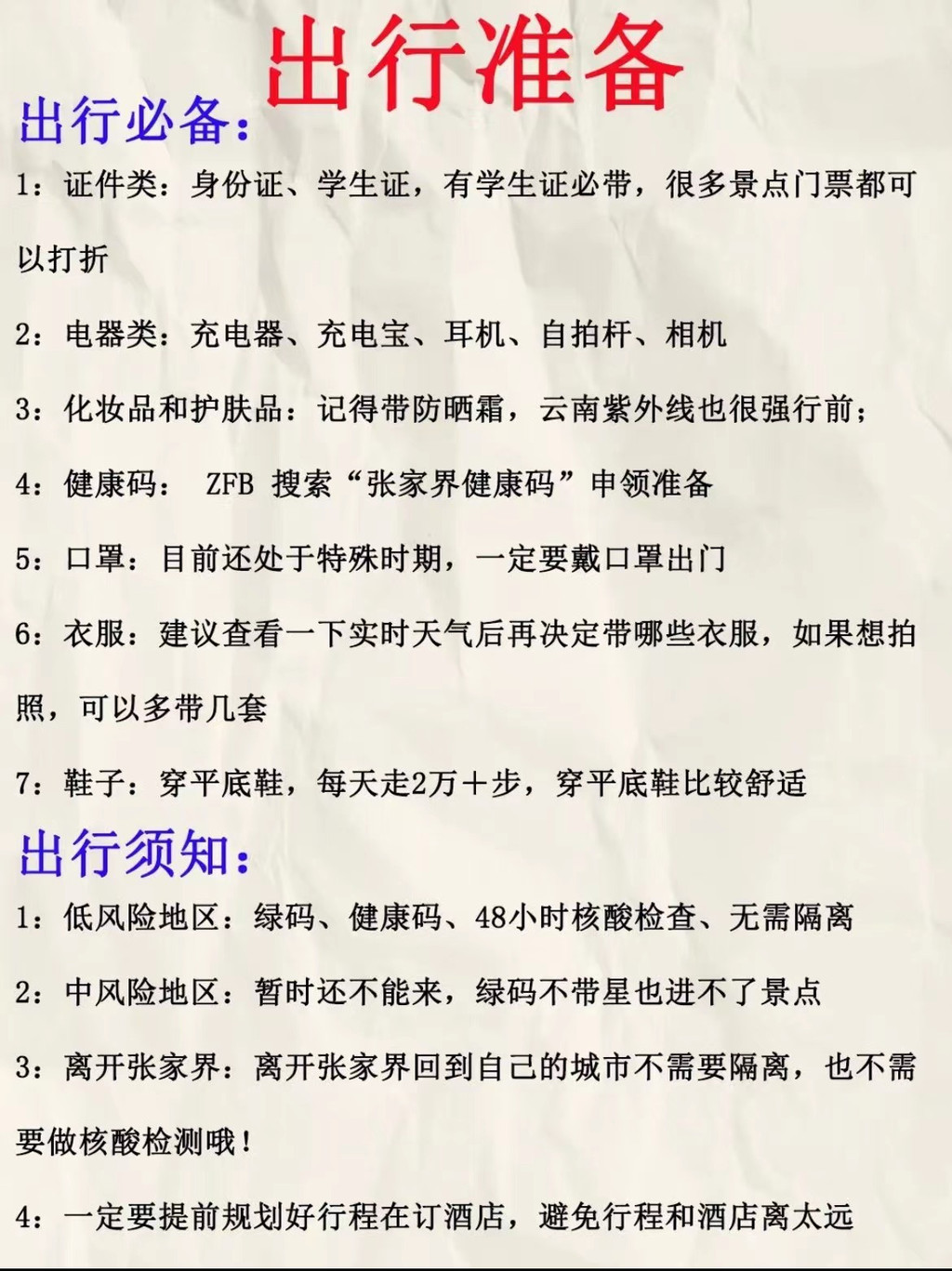 小贴士:记得带薄外套、墨镜、晴雨伞、披巾,去张家界会用得