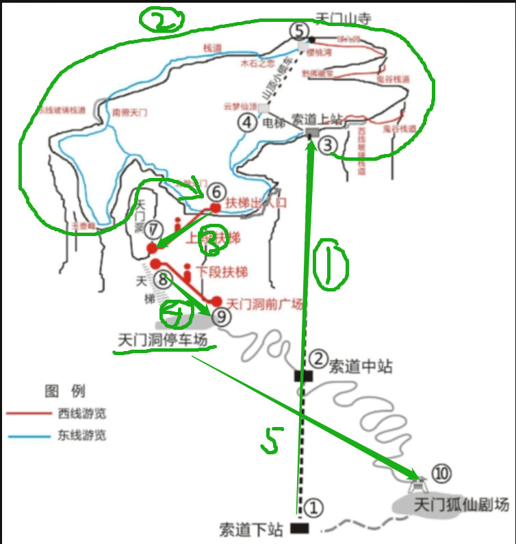 本次攻略的重头戏来了!在出发前,对于要不要去天门山这件事,我们做了好多攻略和心理建设。因为在网上看到的攻略,无论选择A线、B线还是C线,都需要经过玻璃栈道。所以对于恐高且胆子小的我们来说,就很纠结。最后,本着来了就不要错过的原则。我们决定拼一次。于是我们又对于选择哪条线路纠结了很久。这里给大家介绍下我们的路线: