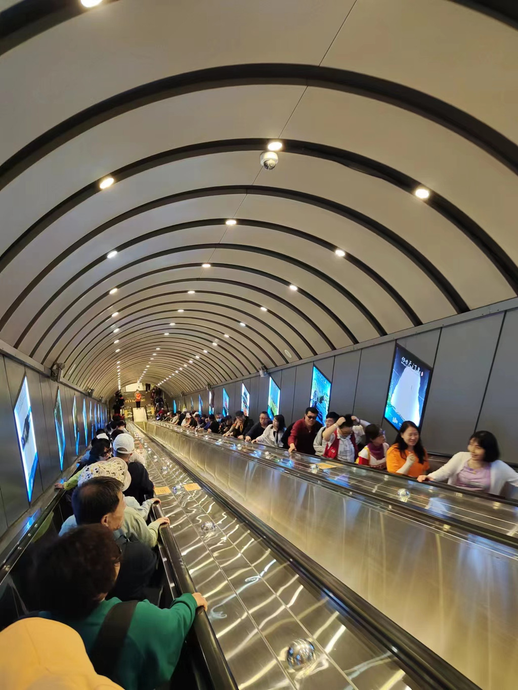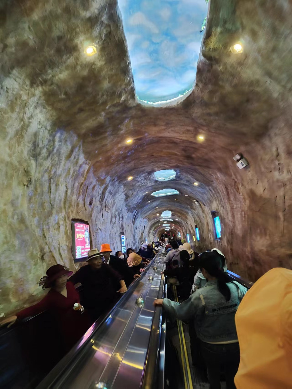 到达扶梯出入口,大家就可以体验最长的穿山扶梯了。一开始真的非常震撼,不过一点点的我们就忘记了坐了几段穿山扶梯了。 经过了东西两线的步行,虽然这里不用走,但站着还是挺累的。出了穿山扶梯以后,我们就来到了天门洞。这里只能看到一个有洞的山体,要想看到完整的天门洞,是要到天门洞广场的呦。