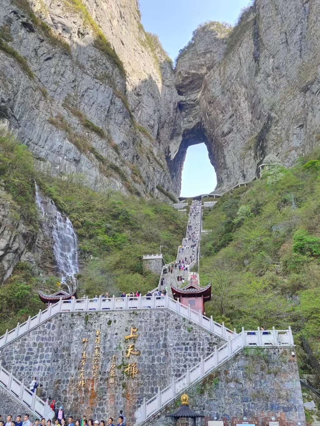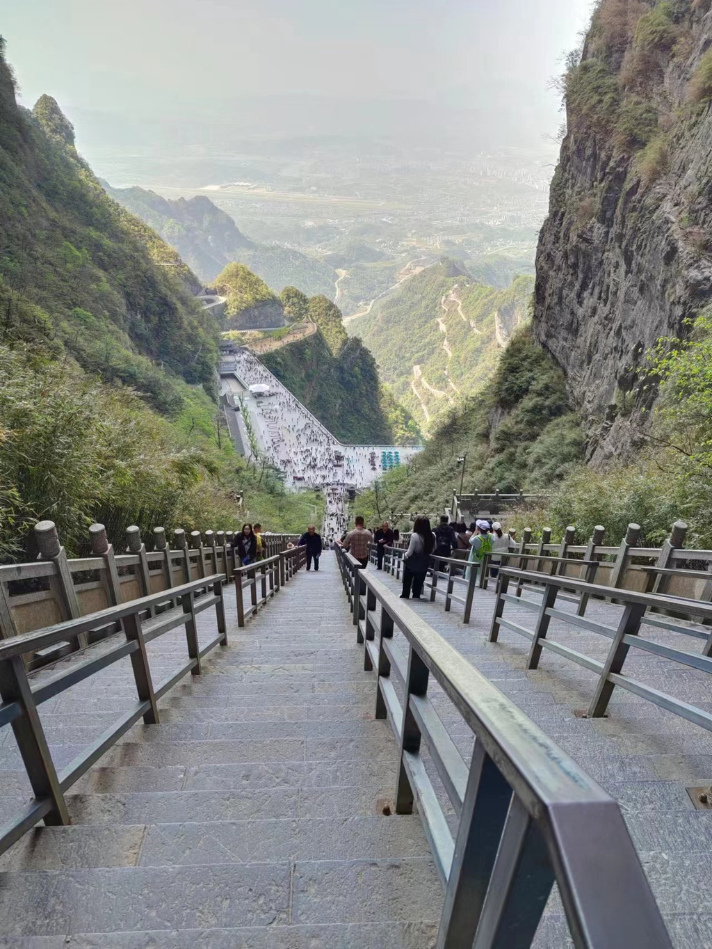 那么,问题来了。大家应该在网上看到了很多天门洞通往天门洞广场那999级台阶。好多人都推荐走下去。说实话,我真心推荐对大家乘坐下段扶梯下去。这钱咱们真不白花,想想咱们走这一路本就辛苦的两条腿,再下999级陡峭台阶,膝盖真心受不了。32拯救2条腿我觉得是不亏。这里,大家自行选择吧。