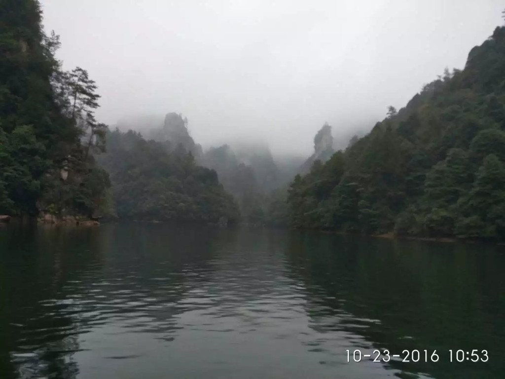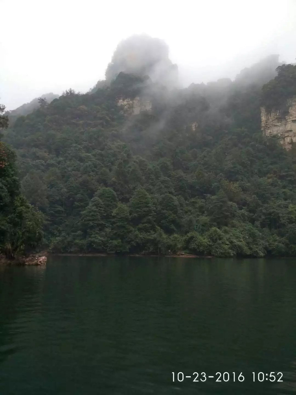 合影后的我们前往索溪峪镇南的被誉为“天上瑶池”的宝峰湖游玩。所见所闻都妙不可言:青山围住碧水,高峡变成平湖,云天印在水面,画船来往其中,歌声回荡山间。风光旖旎,8703的兄弟姐妹们为之兴奋,为之赞叹,为之流连忘返。