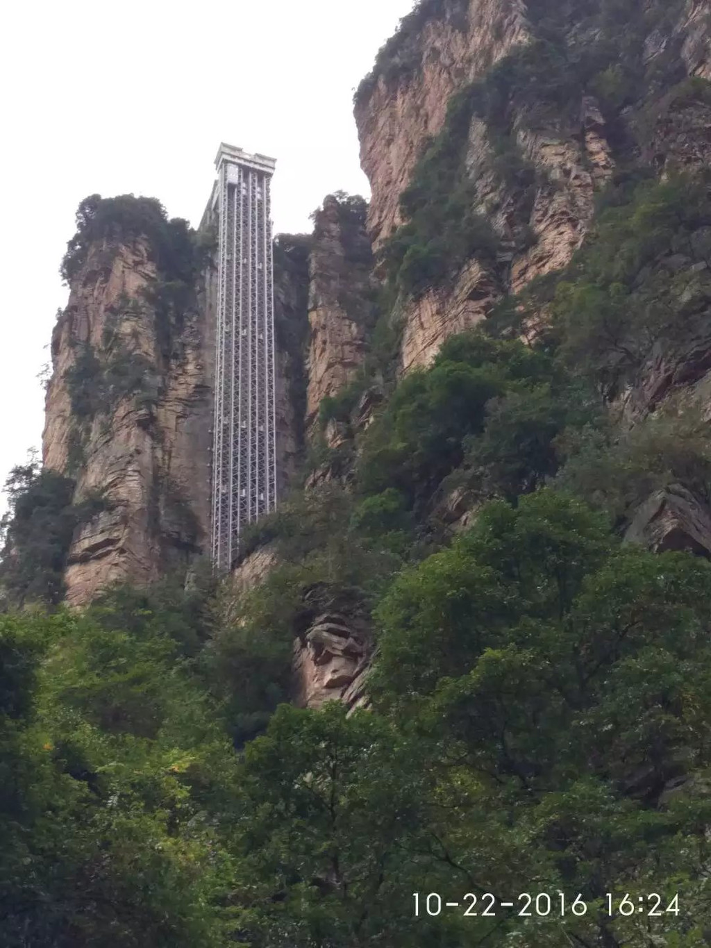 从袁家界下山真是太简单,我们乘坐号称“世界第一梯”的百龙天梯,在电梯外似将军列队般的群峰陪伴下,快速地从山巅来到了山下面。在拔地而起的险峰上竟能修建出这样的垂直电梯,使游客上下山的时间从原来的几小时缩短为一分多钟,真是让人不得不惊叹!