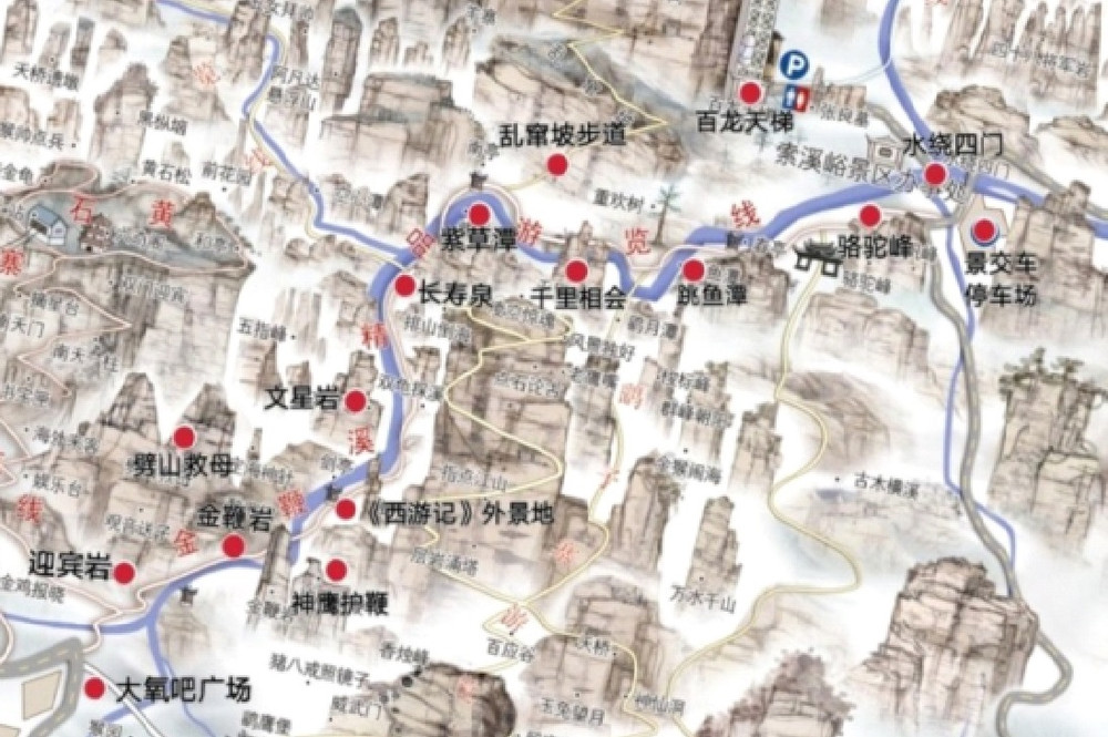 ❤️水绕四门→骆驼峰→跳鱼潭→千里相会→紫草潭→长寿泉→文星岩→劈山救母→师徒取经→《西游记》外景地→神鹰护鞭→金鞭岩→红军路→金鞭溪(西端)→大氧吧广场
