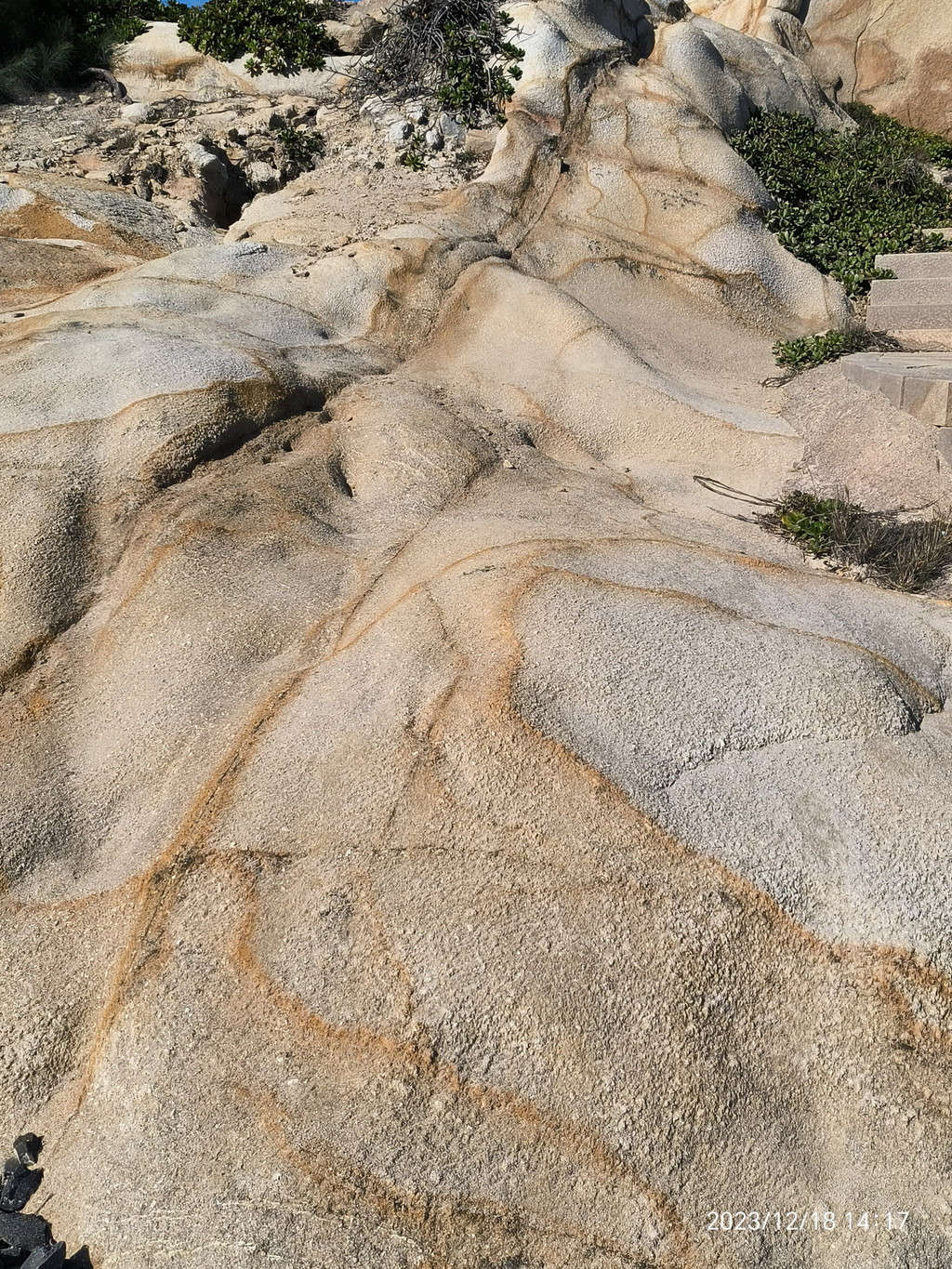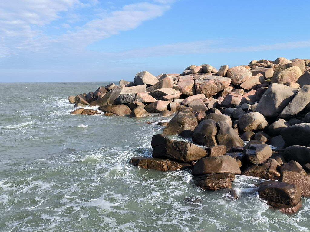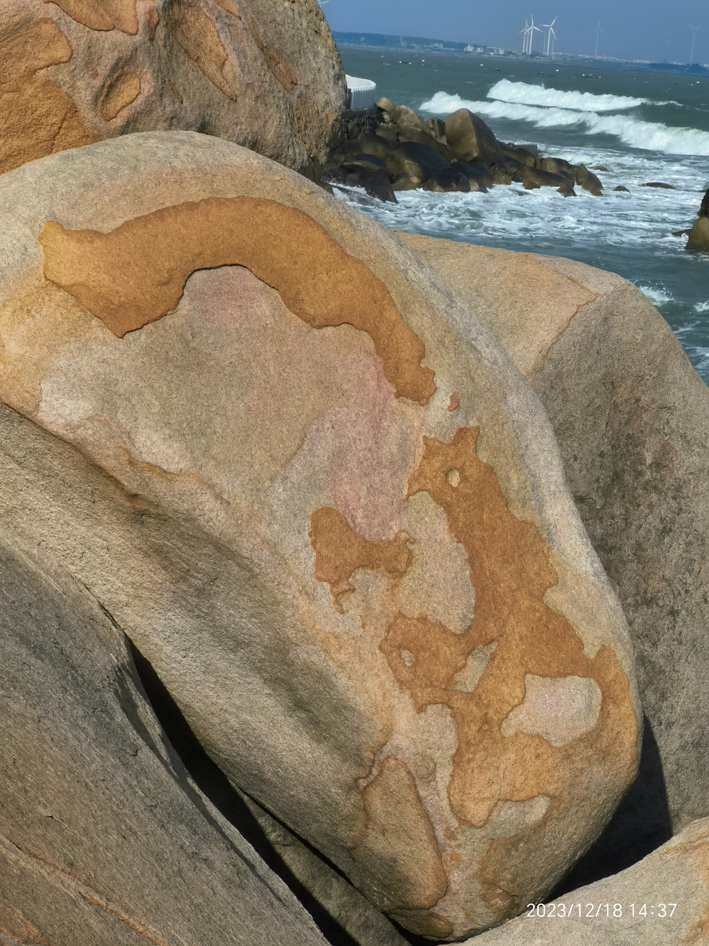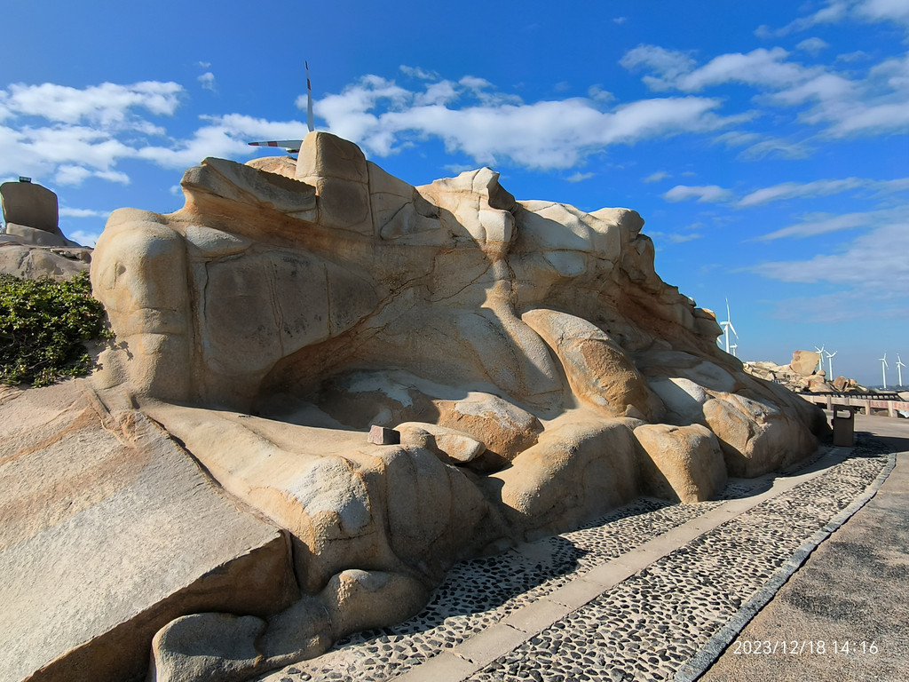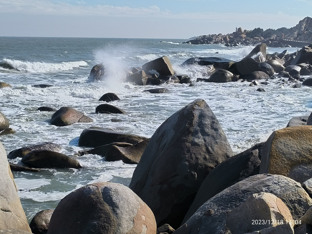 六鳌,大潮裹挟着水珠打湿了步道。岸上一堆堆顽石上却涂满了海水冲不净的线条祖成的画。显然是一种海蚀现象或地质纹理。