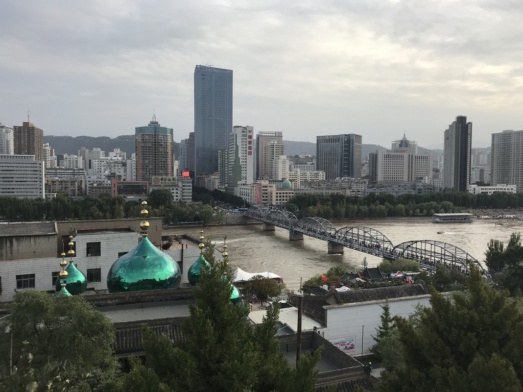 白塔山上看中山桥,绿顶的是兰州水上清真寺。