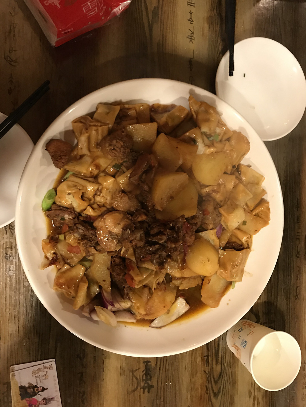里面的店有一半没有营业,转了一圈,最后决定吃“卷子鸡”。88元/盘。鸡肉应该是提前煮熟的,加土豆,面片卷起来,放入高压锅,大约15分钟,出锅。这个量三个人足够吃,我俩都是不浪费粮食的主儿,使劲吃也吃不完,可以打包,可是咱们没地方热去呀,只能浪费掉了。那个卷子很好吃。