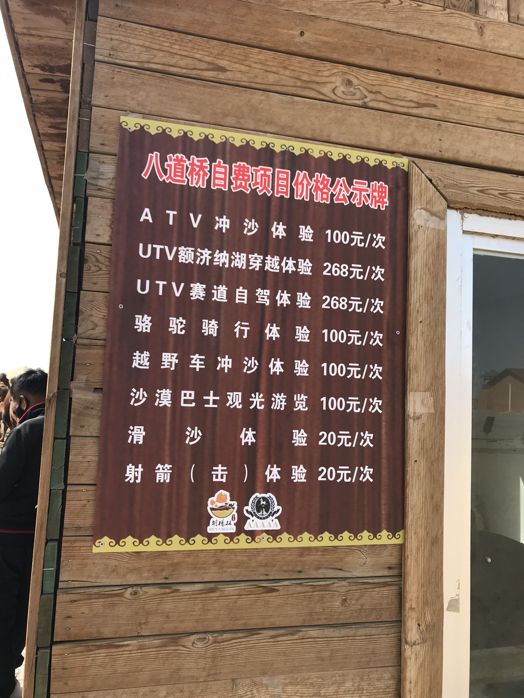 景区内是从一道桥到八道桥,所有人要从一道桥步行到二道桥才能坐车到其他地方,当天三道桥、四道桥不开放,导游推荐二、五、七道桥。果然,二道桥的树比较年轻,大部分叶子都变黄了,五道桥是《英雄》的拍摄地,树龄比较老,所以大部份都还是绿的,七道桥也是小树,也有水,可观性较好。八道桥如果不是为坐车,可以忽略不看。八道桥是沙漠,并且是被圈起来的沙漠,你想光脚进去玩砂子都不行。全是娱乐项目。