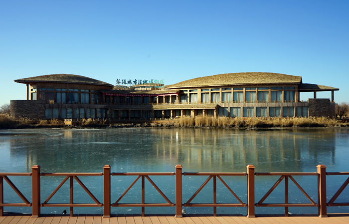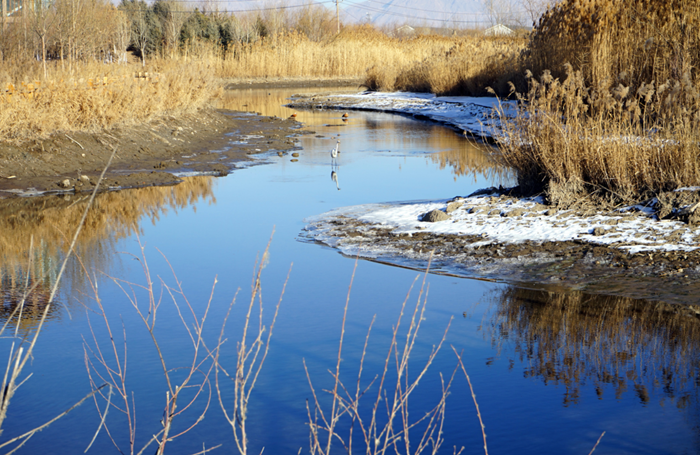 张掖国家湿地公园的水面特别清澈。但是和内陆的湖面有不一样。这里看上去有那种淡淡的沙粒感,等我们靠近才知道,原来湖面已经结冰。