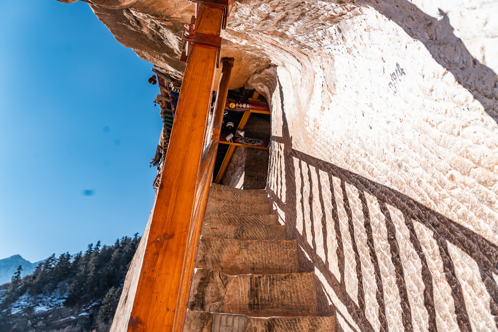 来马蹄寺一定不要错过三十三天石窟。从此门进入石洞沿着陡峭的台阶逐级向上,可以参观到每一层的石窟,心中油然而生的敬佩古人的智慧和惊人的创造力。