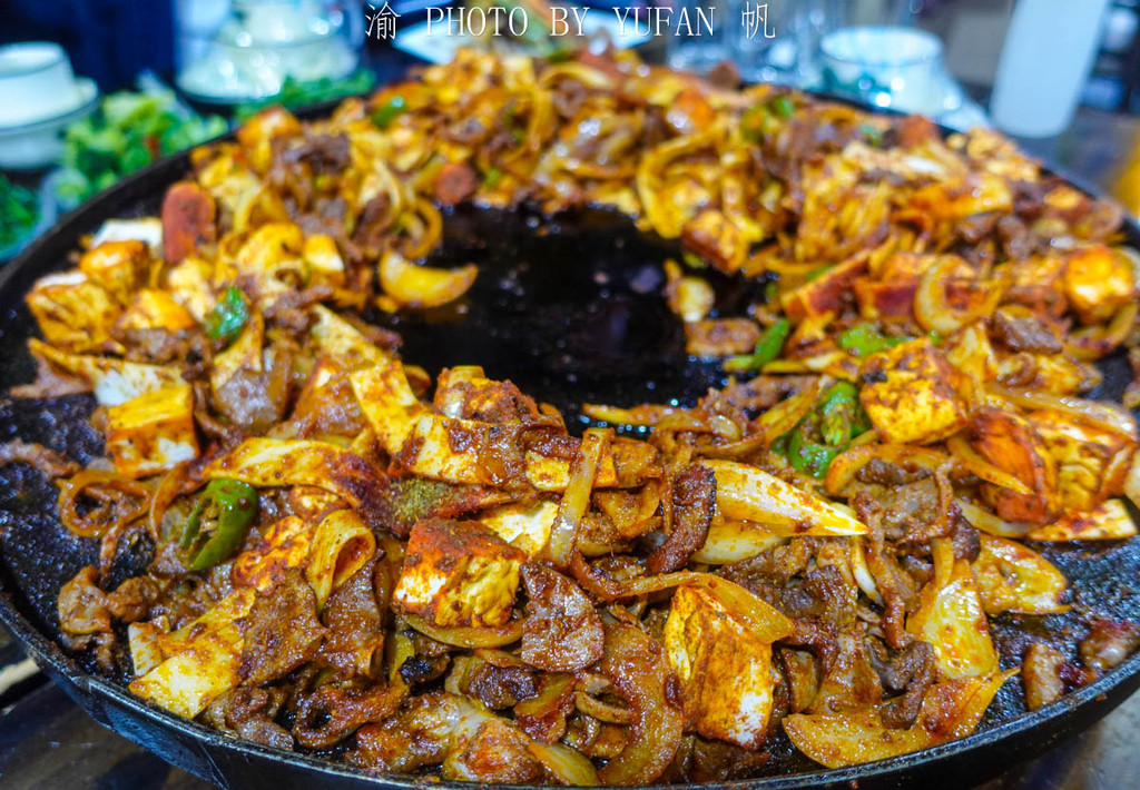 炒拔拉,这也是我们在甘州市场吃到的一种张掖特色美食,看上去一大盘,里面有面皮、面饼、牛肉、牛杂、羊杂等,麻辣适度,还可边炒边吃,美味可口,热热乎乎,气氛有点像重庆的火锅,实在是一种值得推荐的地方美食,大家有机会可去尝尝。