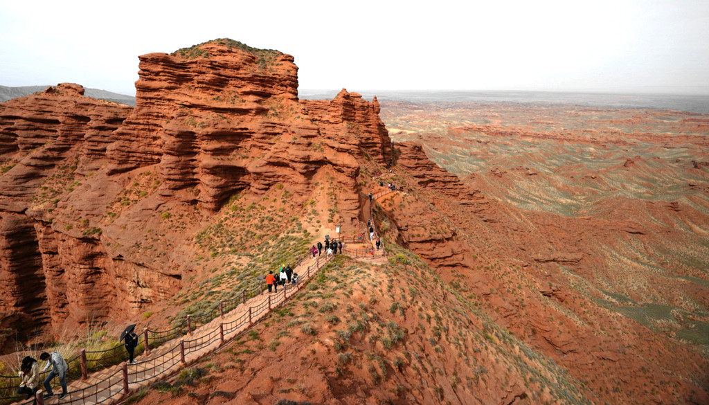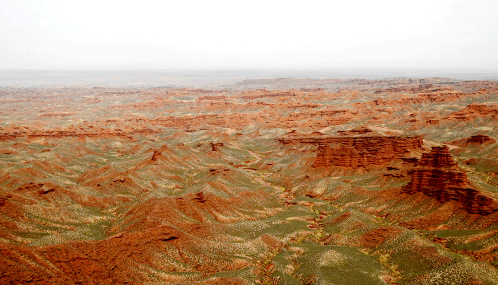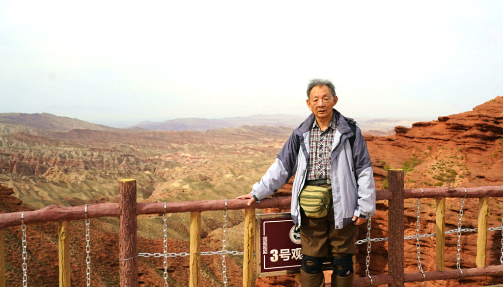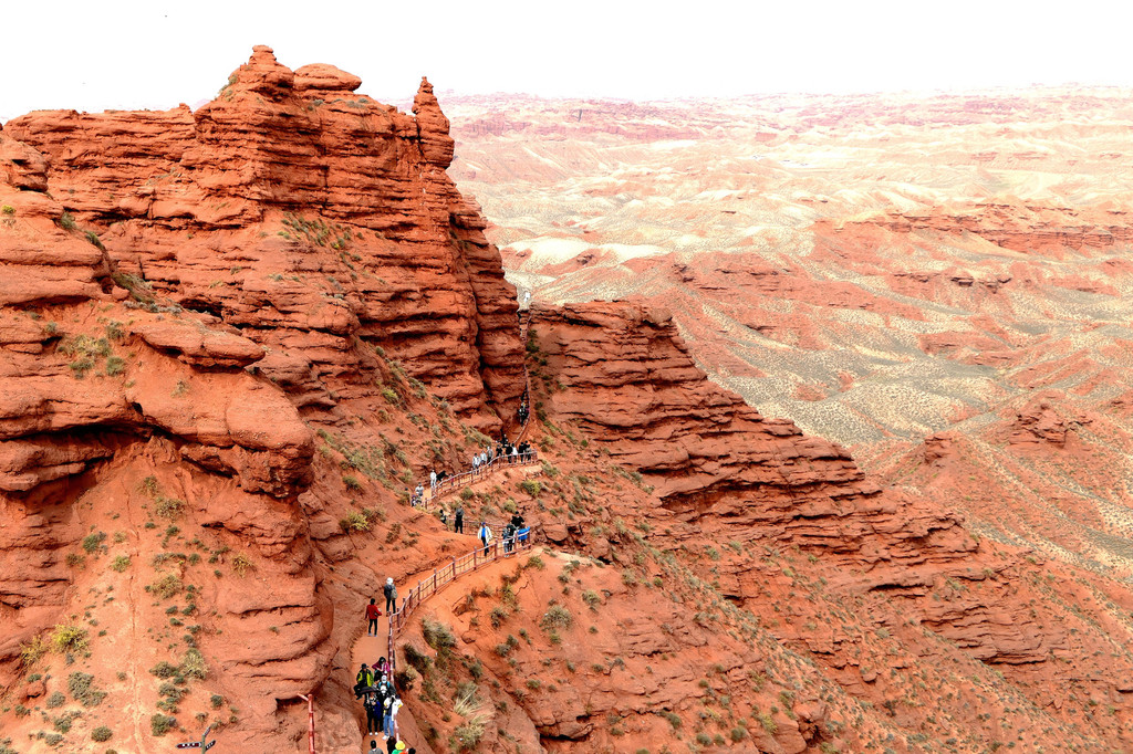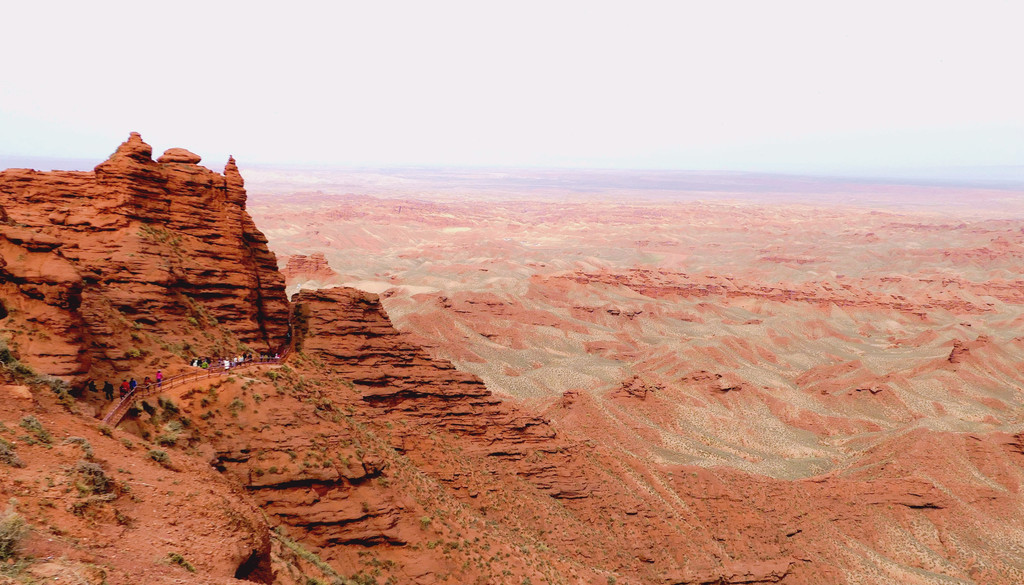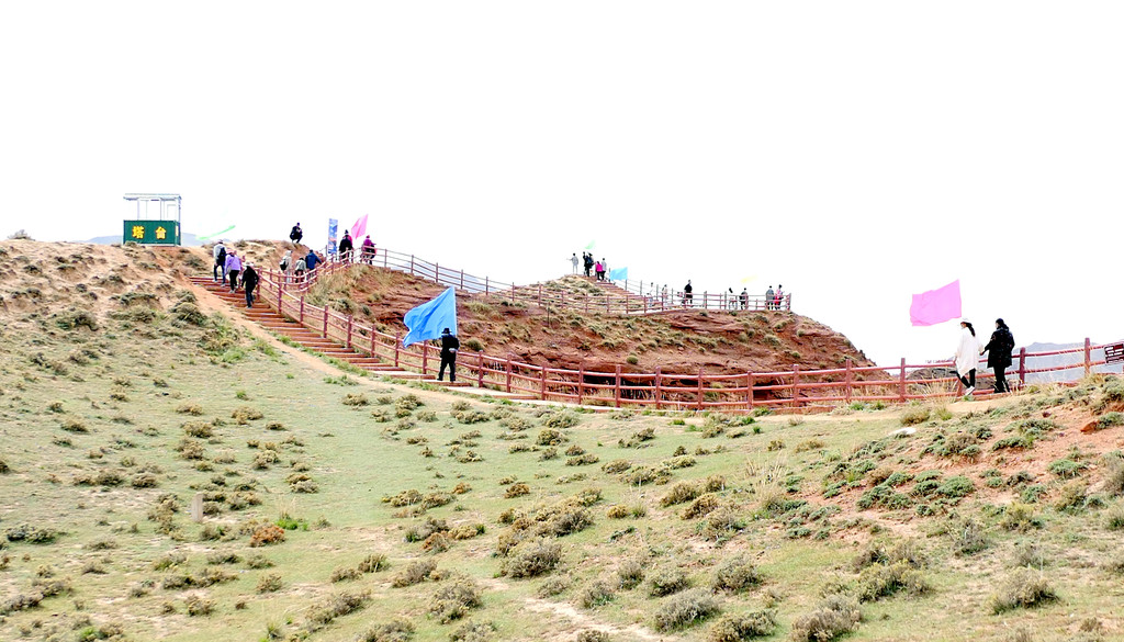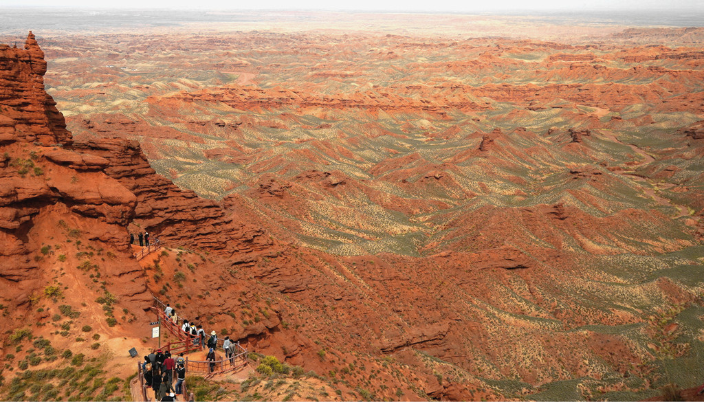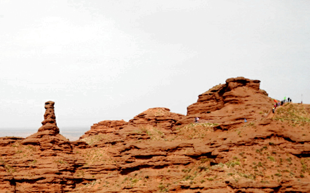 登上一号观景台眺望,脚下是一大片的赭红色山岩、土丘,山岩形状奇特,层层叠叠,土丘都是低矮平缓,形成一道道的土埂,一眼望不到边。这在地质学上叫做“红层地貌”。“红层”是指距今一亿八百万至两亿四千万年以前,由中生代侏罗纪至新生代第三纪的沉积所形成的红色砂砾岩系,由于沉积物中富含铁质,于是就形成了厚厚的红色岩层,也即“红层”。景区虽称“平山湖”,但其实这里并没有湖,甚至都没什么水,不过,在遥远的古代,这一带确实曾经碧波浩瀚,后来地面抬升,湖水消退,再经水流侵蚀、风沙磨损,久而久之,大自然的鬼斧神工就把史前湖底的厚厚红色砂砾岩层,雕琢成了现时的模样。我站在一号观景台上眺望,脚下的一道道土埂高低起伏,其势犹如大海中的波涛,所以,这处景点又被称作“九龙汇海”。