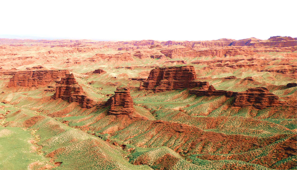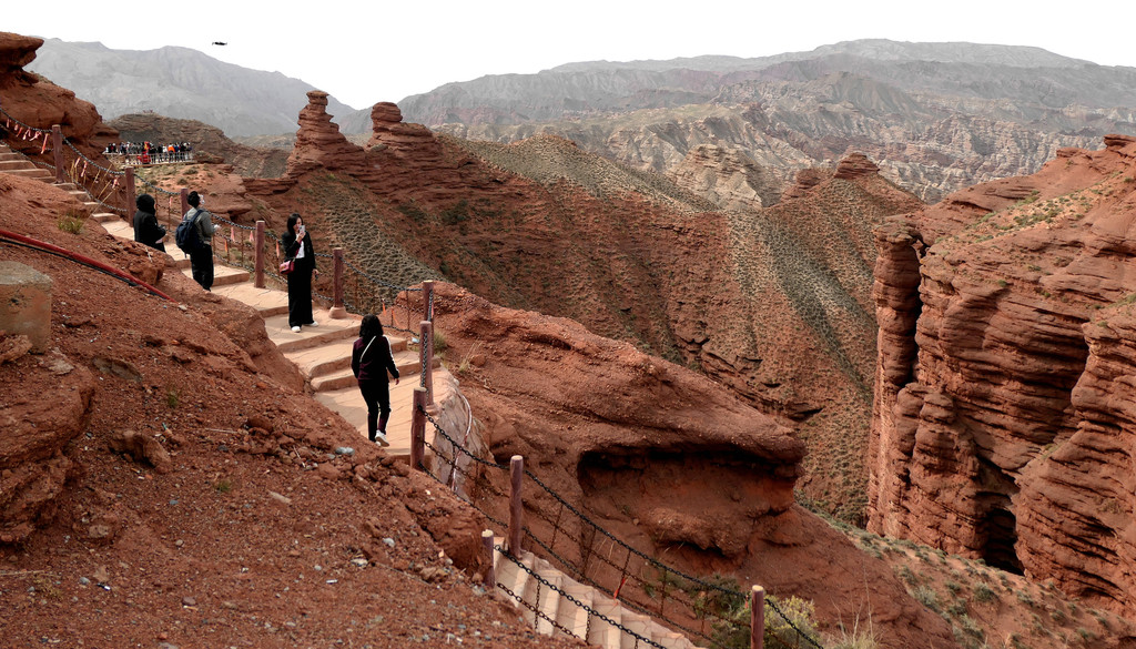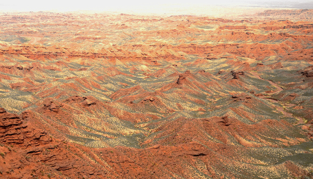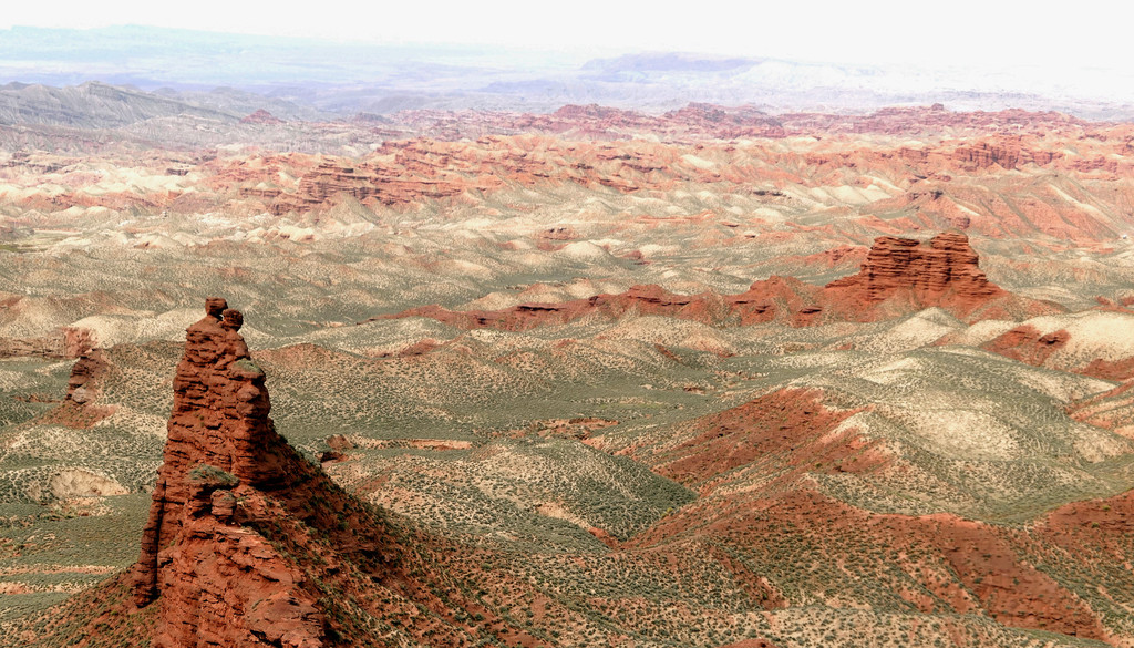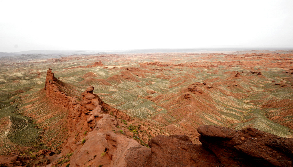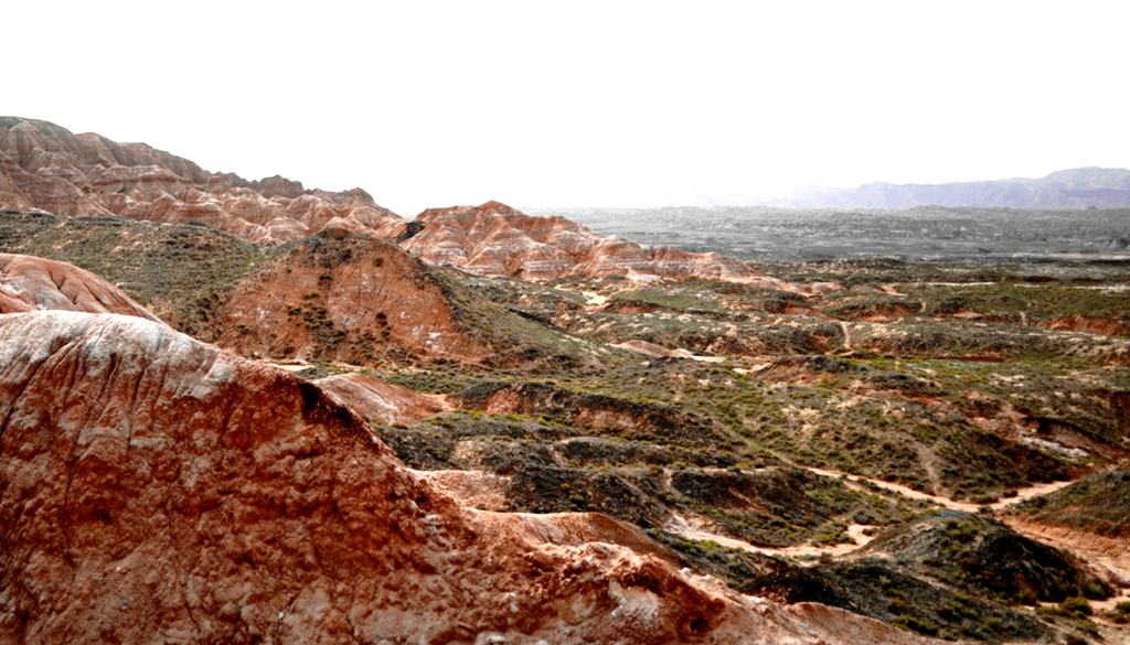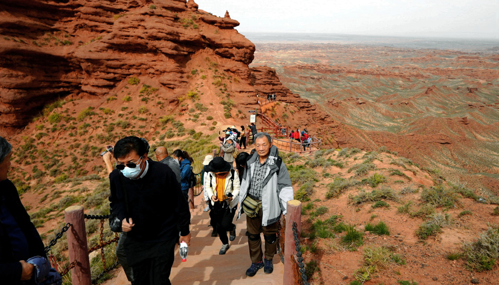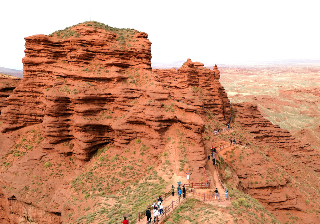 登上一号观景台眺望,脚下是一大片的赭红色山岩、土丘,山岩形状奇特,层层叠叠,土丘都是低矮平缓,形成一道道的土埂,一眼望不到边。这在地质学上叫做“红层地貌”。“红层”是指距今一亿八百万至两亿四千万年以前,由中生代侏罗纪至新生代第三纪的沉积所形成的红色砂砾岩系,由于沉积物中富含铁质,于是就形成了厚厚的红色岩层,也即“红层”。景区虽称“平山湖”,但其实这里并没有湖,甚至都没什么水,不过,在遥远的古代,这一带确实曾经碧波浩瀚,后来地面抬升,湖水消退,再经水流侵蚀、风沙磨损,久而久之,大自然的鬼斧神工就把史前湖底的厚厚红色砂砾岩层,雕琢成了现时的模样。我站在一号观景台上眺望,脚下的一道道土埂高低起伏,其势犹如大海中的波涛,所以,这处景点又被称作“九龙汇海”。