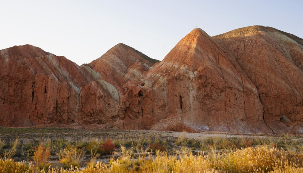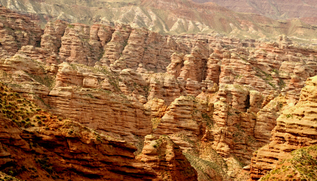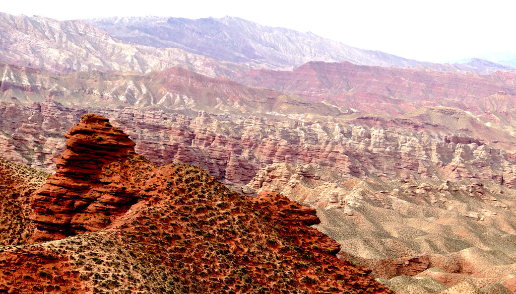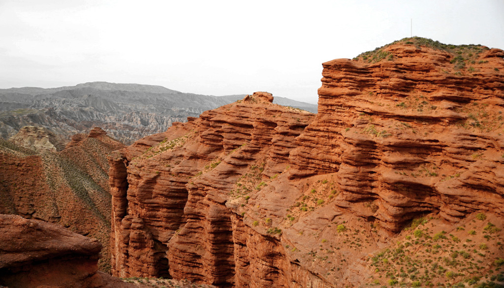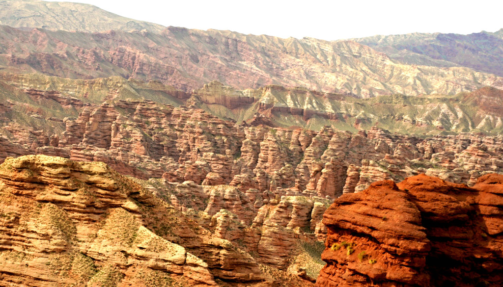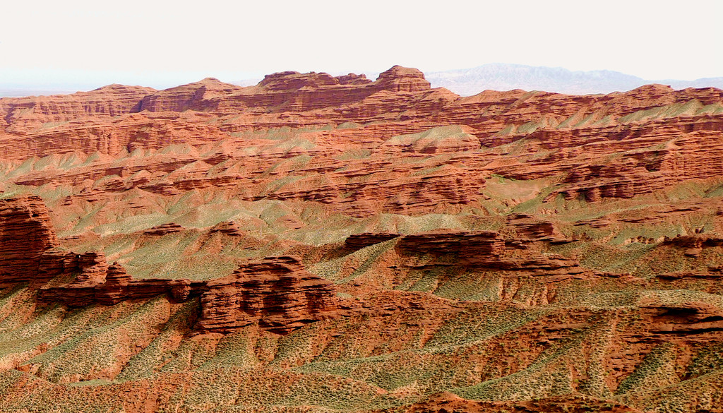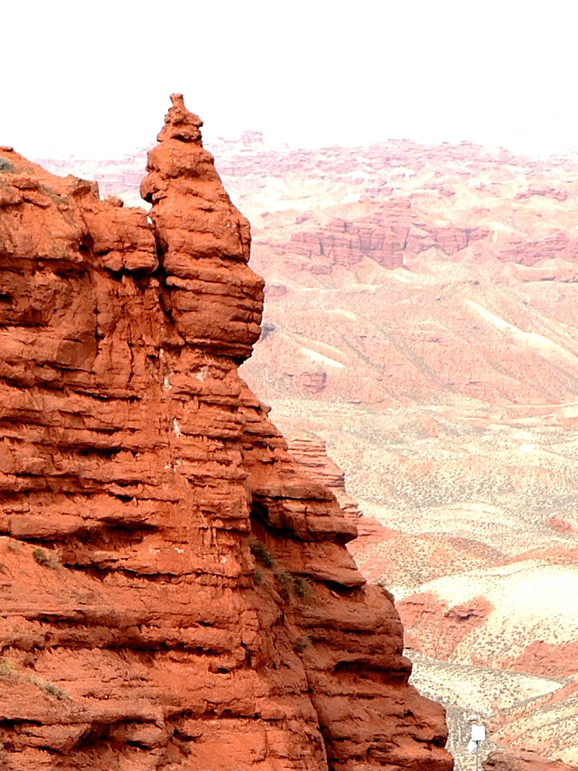 登上一号观景台眺望,脚下是一大片的赭红色山岩、土丘,山岩形状奇特,层层叠叠,土丘都是低矮平缓,形成一道道的土埂,一眼望不到边。这在地质学上叫做“红层地貌”。“红层”是指距今一亿八百万至两亿四千万年以前,由中生代侏罗纪至新生代第三纪的沉积所形成的红色砂砾岩系,由于沉积物中富含铁质,于是就形成了厚厚的红色岩层,也即“红层”。景区虽称“平山湖”,但其实这里并没有湖,甚至都没什么水,不过,在遥远的古代,这一带确实曾经碧波浩瀚,后来地面抬升,湖水消退,再经水流侵蚀、风沙磨损,久而久之,大自然的鬼斧神工就把史前湖底的厚厚红色砂砾岩层,雕琢成了现时的模样。我站在一号观景台上眺望,脚下的一道道土埂高低起伏,其势犹如大海中的波涛,所以,这处景点又被称作“九龙汇海”。