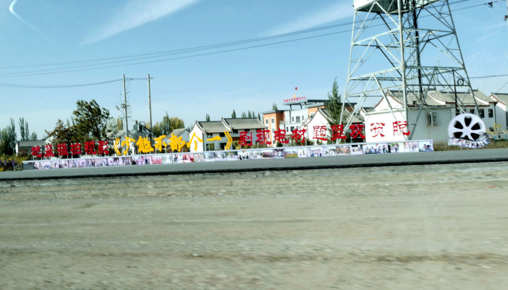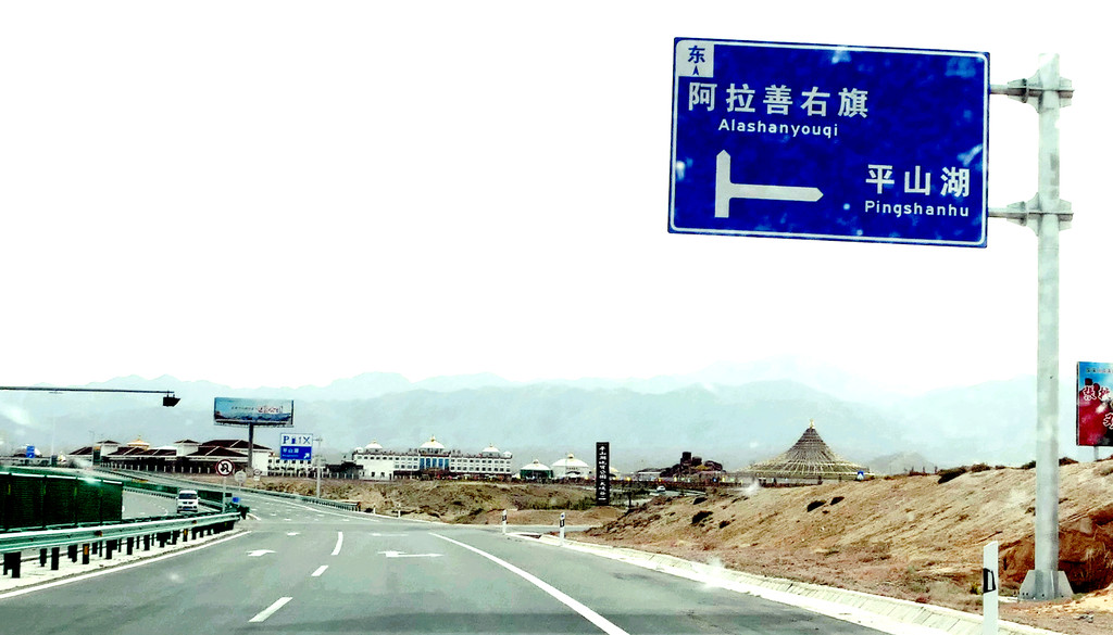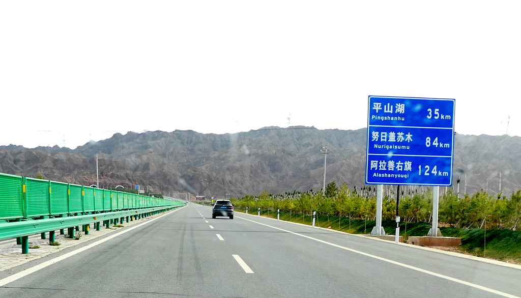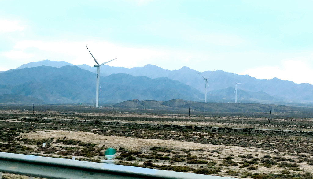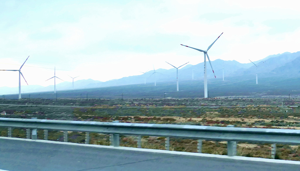 离开博物馆已是下午四点多钟,我俩今日还没吃过午餐,X.J.选中一家路边店,自己吃番茄牛肉面,为我点了烤肉拌饭。我胃口不错,吃得很香,X.J.则是将大半碗面都剩下,还一再劝我少吃,留点儿胃口晚上再去张掖吃大餐。饭后上路,16:56经“武威北”再上连霍高速,直接驶往张掖。17:34驶经“永昌服务区”,继而又驶过永昌县城(隶属金昌市),周围景色开始明显改变,树木、田野逐渐减少,出现了大面积的荒漠。17:56经过庞大风车阵列,此处应该是风力发电的风场。